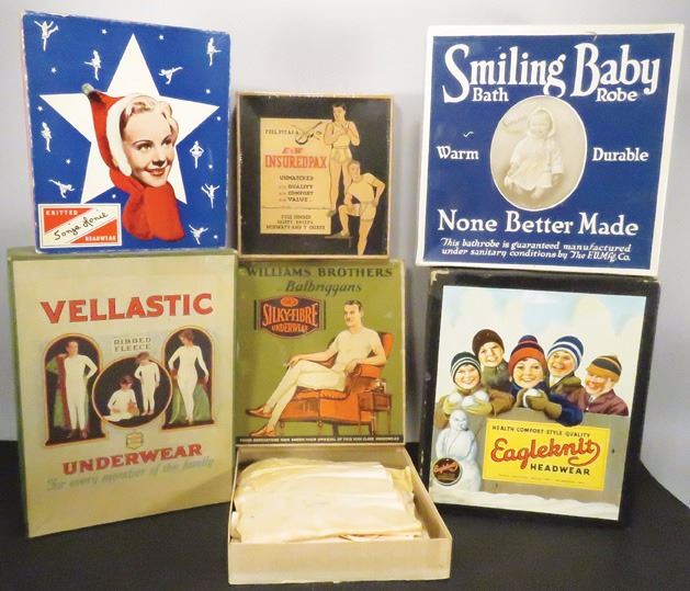 Collection of Millinery Product Boxes. F&W Insurepax-undershirts, Sonja Henie knit headwear, Silky-Fibre Underwear, Eagelknit Headwear, Vellastic Ladies Union Suits and Infant Bathrobe. Great graphics. Good overall condition.
