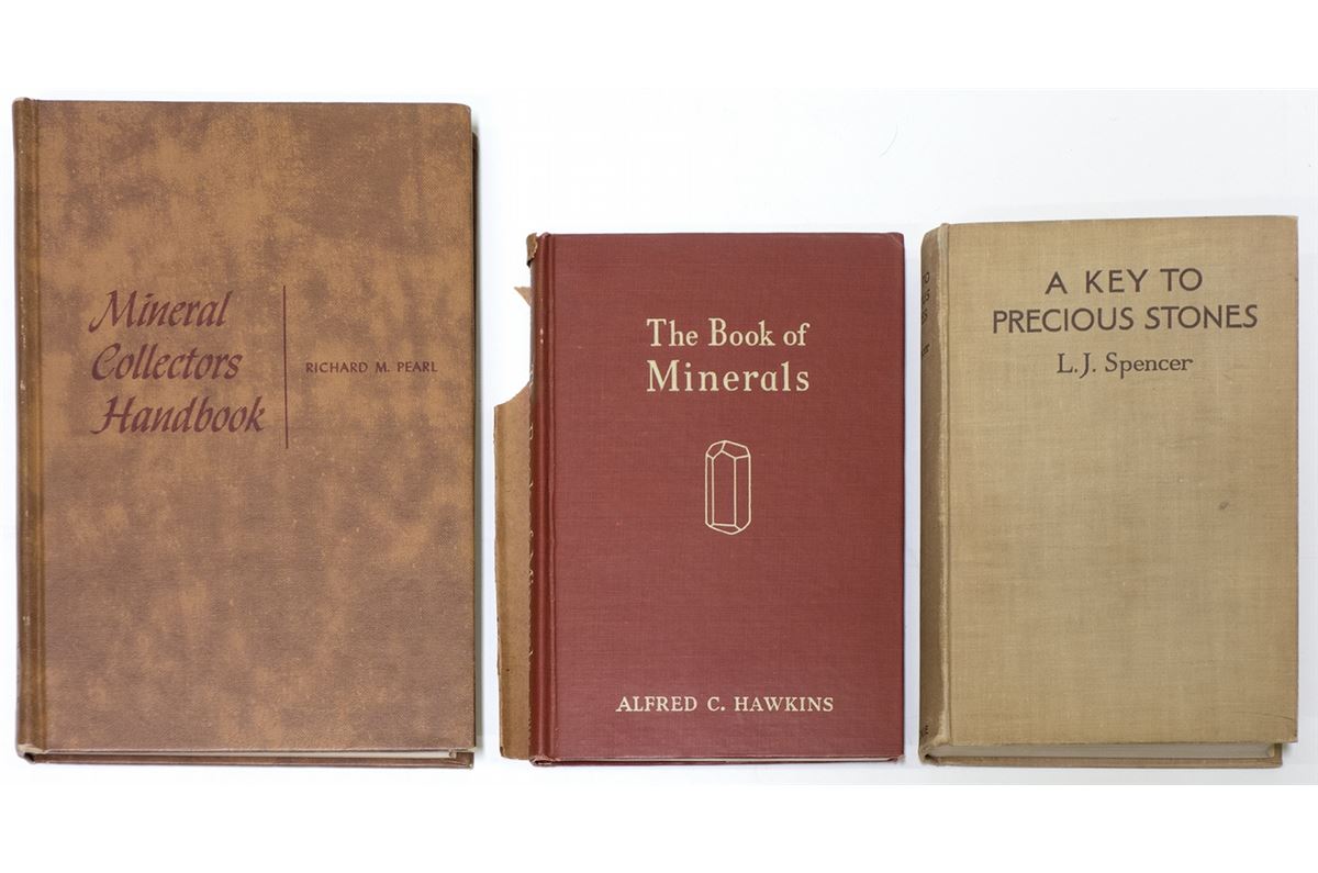 Lot of three. 1) "Mineral Collectors Handbook" by Pearl. 1947. First edition. Excellent condition. 2) "The Book of Minerals" by Hawkins. 1935. 3) "A Key to Precious Stones" by Spencer. 1936.