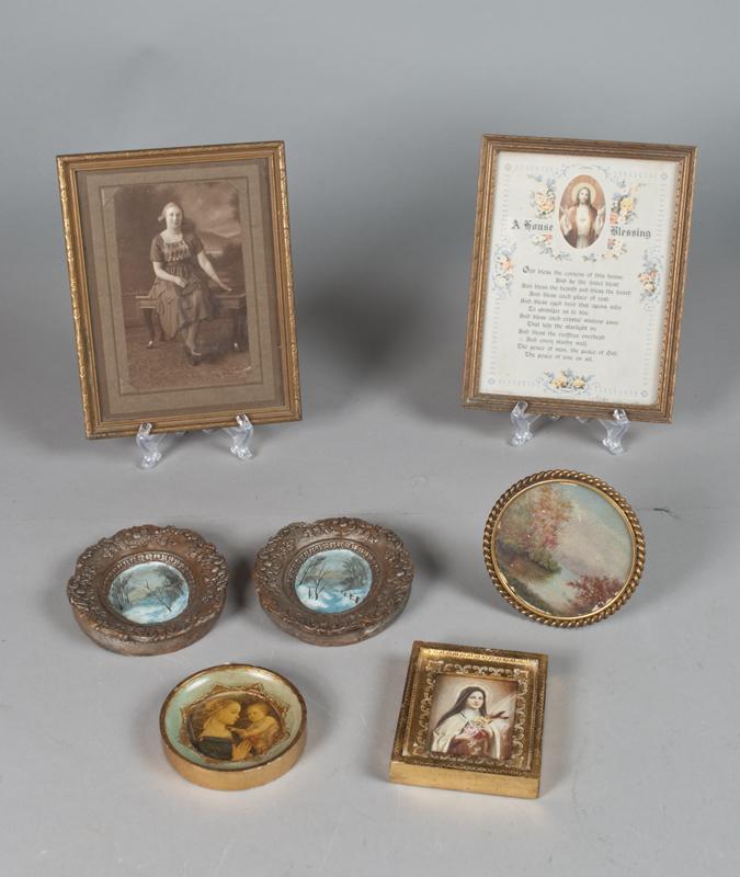 Includes a circular framed print of Madonna and child, 3 & 5/8" Dia. A pair of ceramic painted winter scenes, 5" L, signed Janice Sparks, 1973. A circular painting of a river scene, 4.5" Dia. A framed print of religious figure, 4.25" L. A framed House Blessing, 9" L, and a framed antique photo of a girl, 9" L.