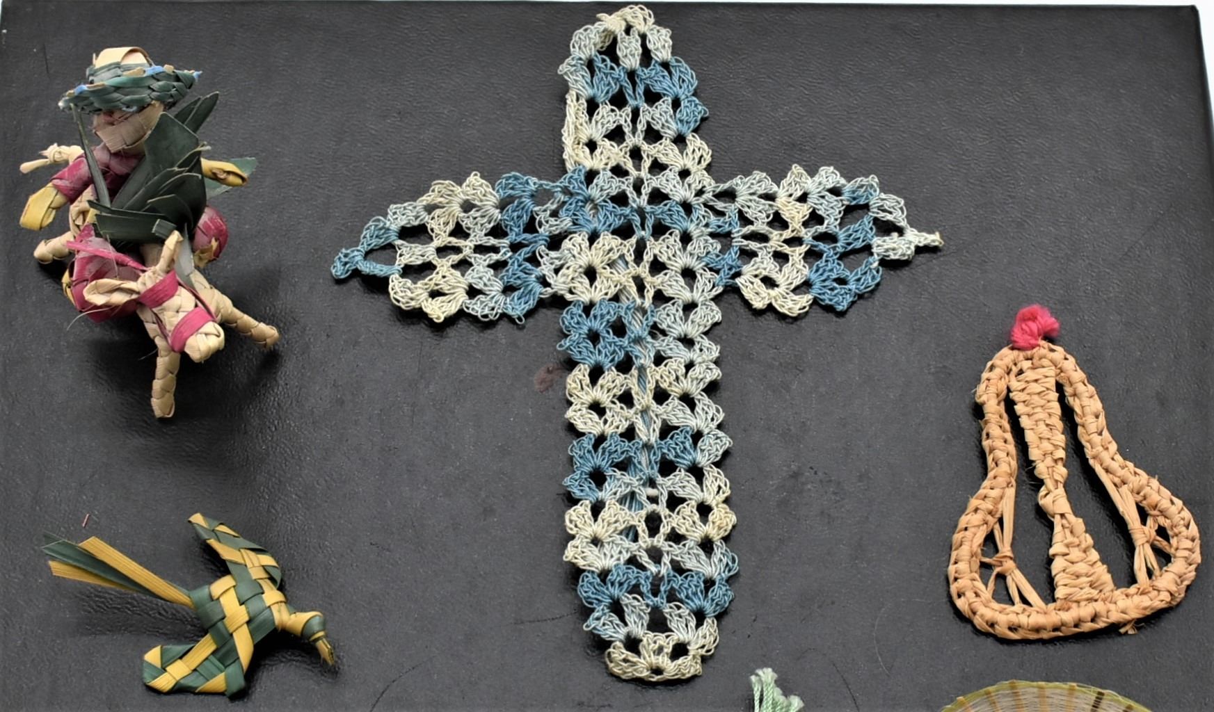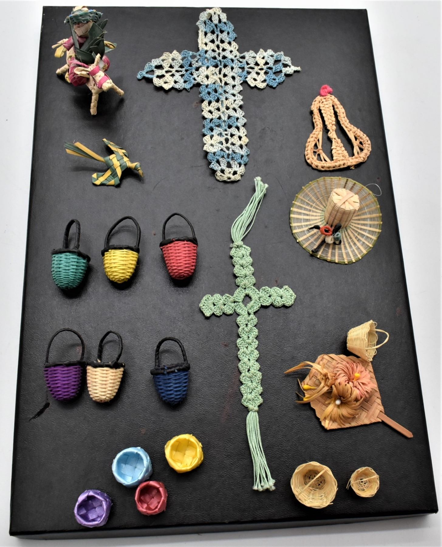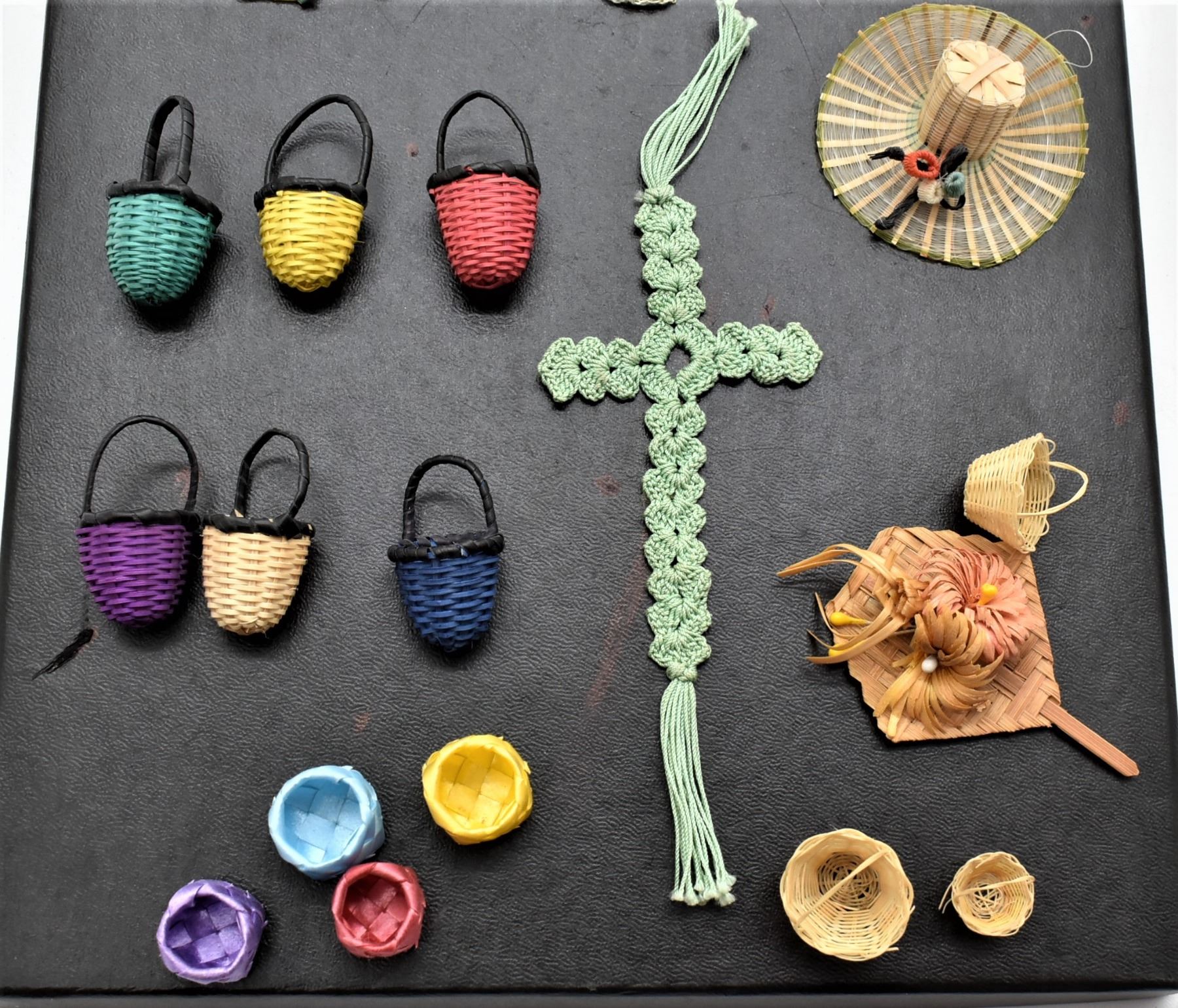 Collection of Miniatures, includes 13 miniature wicker baskets, 1 wicker fan, 1 wicker hat, wicker bell, wicker bird, wicker horse with rider, 2 tatted lace crosses, longest is the blue and white cross measuring 9''L (which includes the tie) x 4''W, very colorful collection