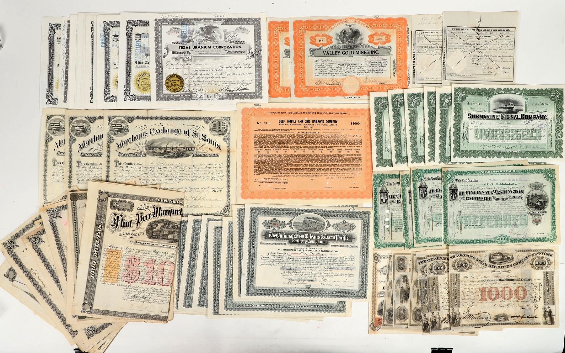 .Lot of 83. I/C,I/U. Includes: The Cincinnati, Washington and Baltimore Railroad Co., Flint & Pere Marquette Railway Co. Bonds, Belt Railroad & Stockyard Co. The Cincinnati, New Orleans & Texas Pacific Railway Co. Valley Gold Mines. Texas Uranium Corp., Electric Dice Game Co., Merchants Exchange of St. Louis, Pennsylvania Canal Co. Bond, The Orinoco Steam Navigation Co. of New York (One share @ $1000), Boston and Providence Railroad Co., Louisville Bridge Co. , Tauton Branch Rail Road Corp. Printers: T. Sinclair's, Columbian BNC, The Strobridge Litho, American BNC, Henry Seibert & Sons. Various Cond. Many have revenue stamps from 2c ,4c,5c ,10c 25c and $1.