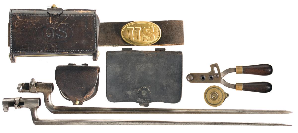 1) Black leather cartridge box marked "J. DAVY & CO. / NEWARK N.J.". 2) black leather cartridge pouch marked "E. GAYLORD / CHICOPEE / MASS." on inside flap. 3) "US" embossed black leather cartridge box with canvas cartridge loops on a leather belt with oval "US" buckle. 4) socket bayonet with 22 inch blade and marked "1802". 5) European bayonet with a 20 1/2 inch spike blade and marked with a pair of crown/letter proofs and "Z18". 6) Brass capper marked "J S / IMPROVED". 7) 54 caliber, two cavity (round, conical) Colt iron bullet mold with wooden handles, sprue cutter marked "COLTS / PATENT".