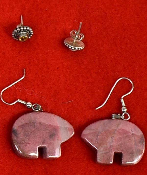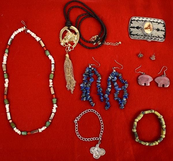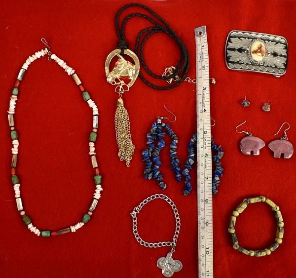 Collection of Miscellaneous Jewelry, longest measures 19.5''L end to end, includes 1. Multi-Stone and Shell Necklace 2. Horse Pendant Necklace 3. Lapis Nugget Earrings 4. Sterling Horse Charm Bracelet (Bracelet itself is not sterling) 5. Horse Belt Buckle 6. Sterling Citrine Post Earrings, marked .925 7. Stone Bear Earrings 8. Serpentine Stone Stretch Bracelet