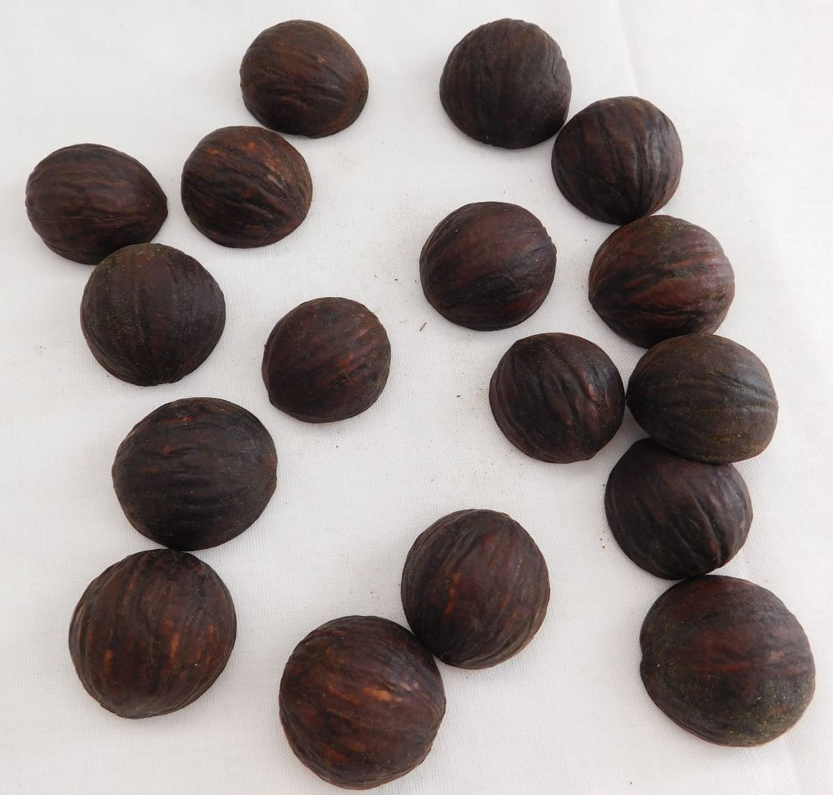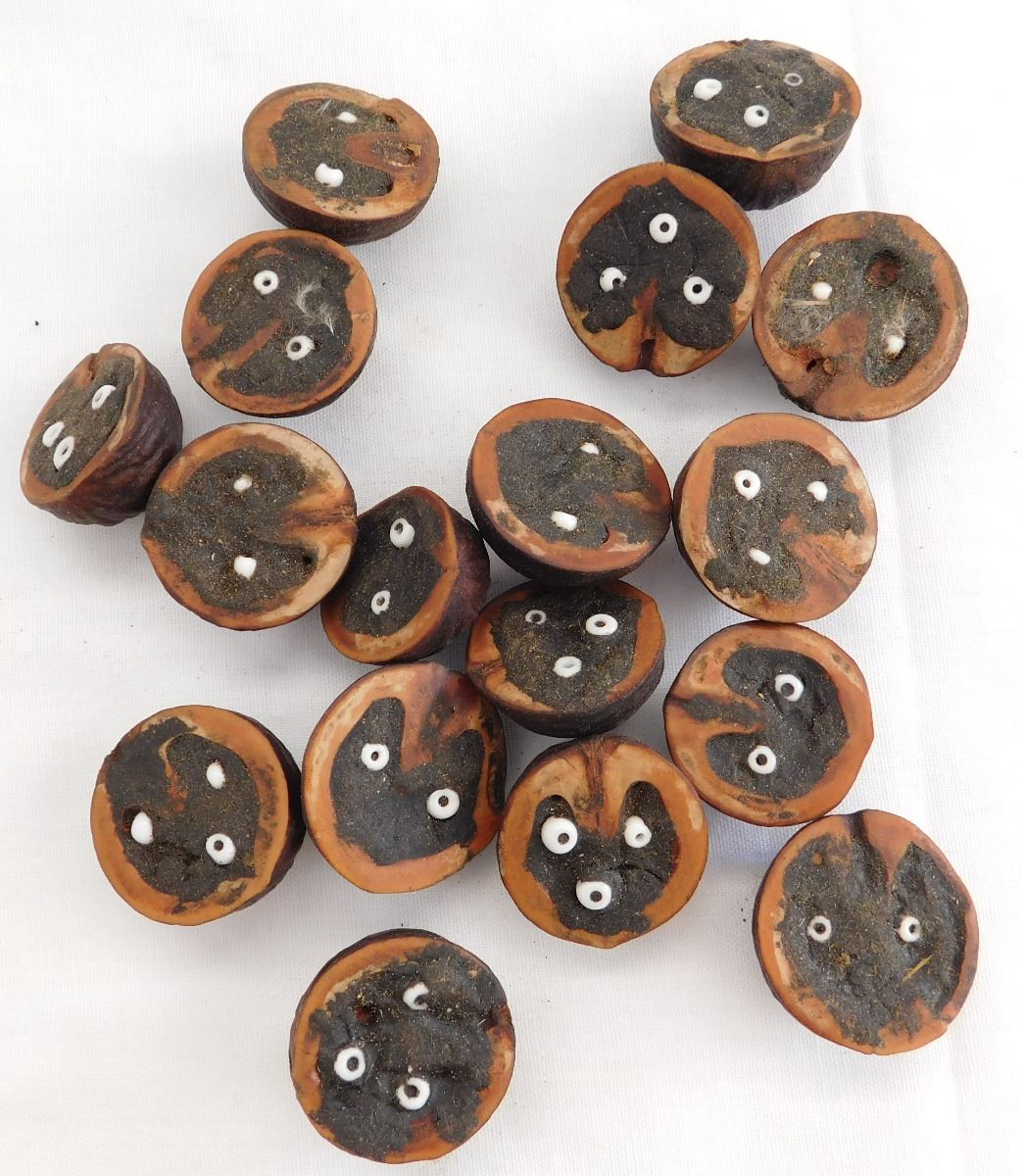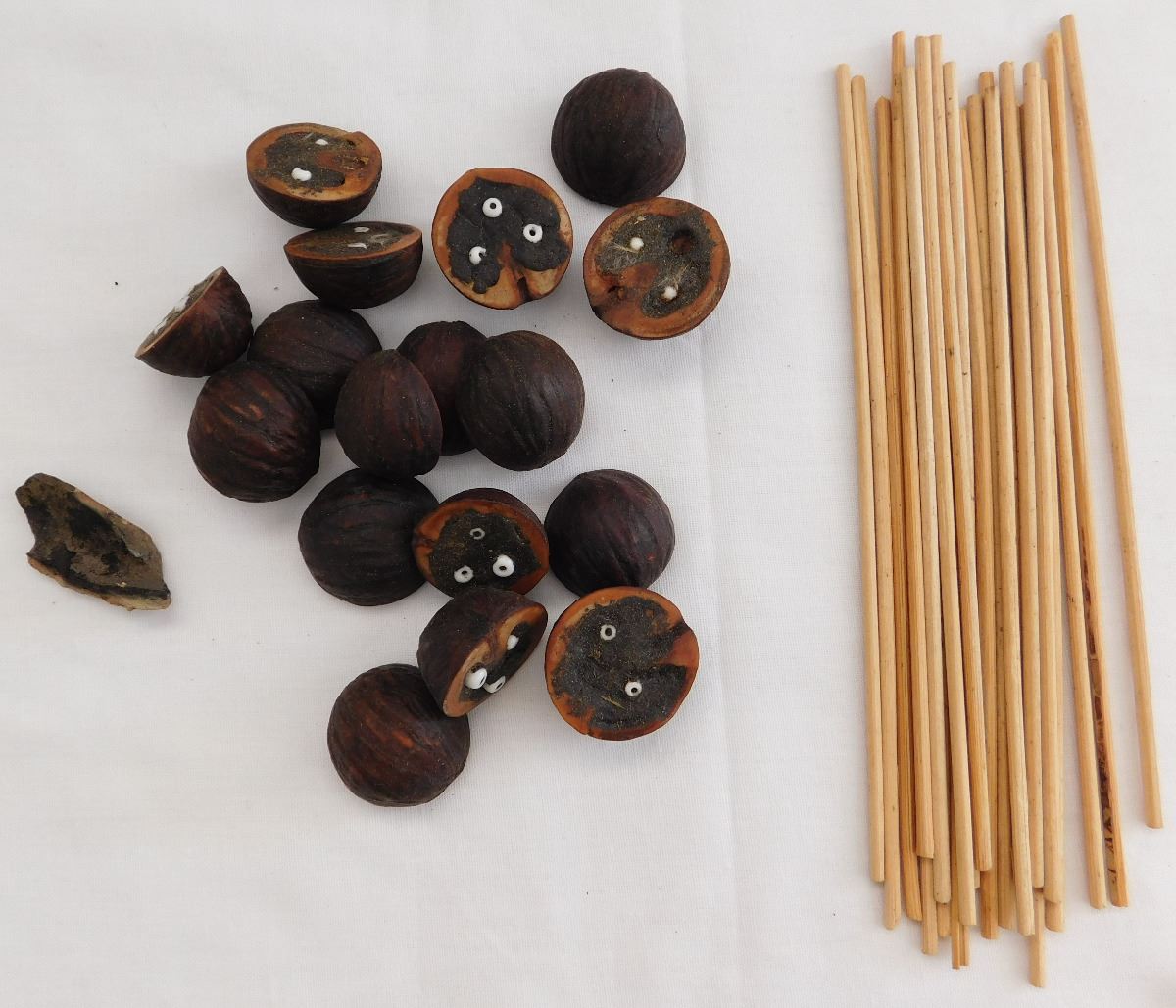 Collection of Mission Indian Gaming Pieces. This collection of Kumeyaay gaming pieces is probably from the 1960s. Also included are 20 small 7" sticks to be used in the game. Items are made with chestnut halves with pitch and glass beads; they measure 1 x 1/2 inches. The sticks are 7 inches long. Condition: Dusty, pre-owned, see images. Shipping: $15.00.