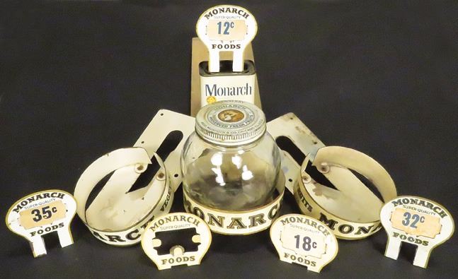 Collection of Monarch Grocery Items. Strawberry Preserve Jar, Cream of Tartar Spice Tin, Monarch tin shelf tags and can holders. Overall good condition.