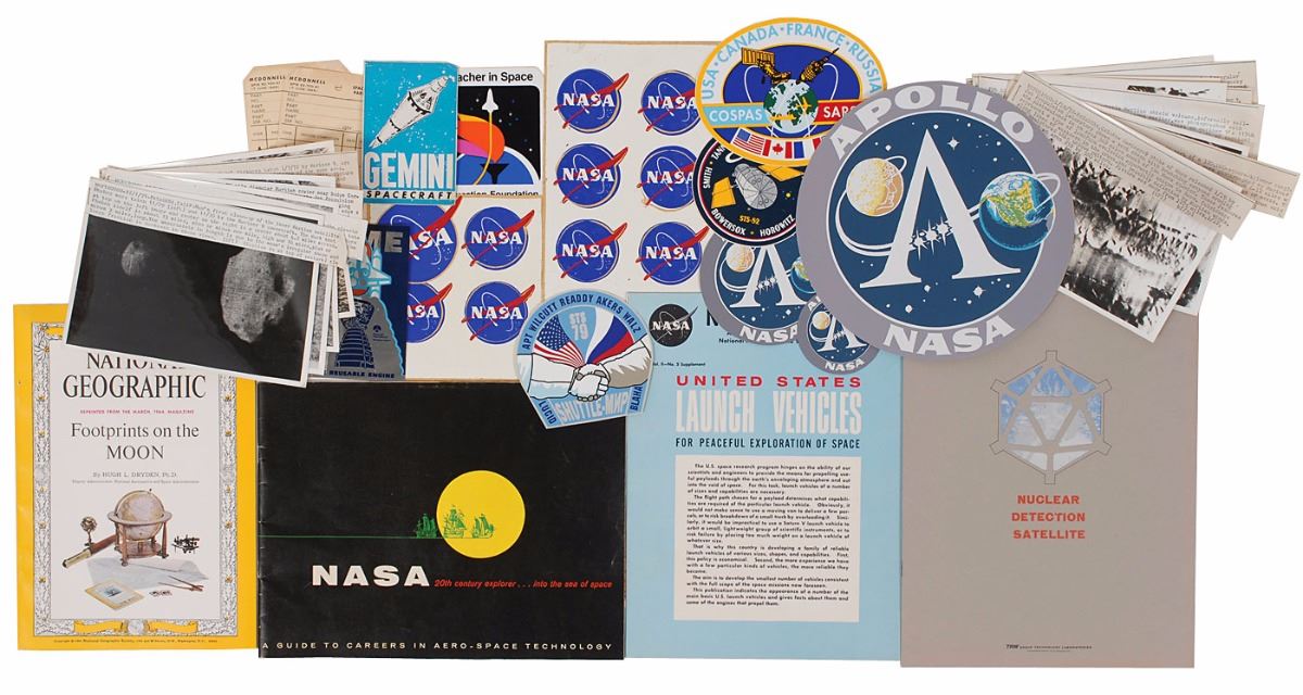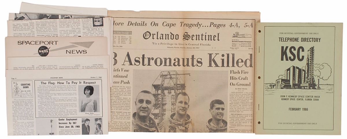 Collection of NASA–related ephemera, predominately from the mid-1960s, including: nine issues of Spaceport News from 1965–1966; three ‘KSC Bulletin’ newsletters from 1965; nine glossy 7 x 5 photos of Mars transmitted by the Mariner 9; a folded poster showing the United States Launch Vehicles; a Nuclear Detection Satellite booklet; a National Geographic magazine; a booklet about NASA employment; the front page of the Orlando Sentinel from the day after the Apollo 1 disaster; twelve NASA logo decals; and a Kennedy Space Center telephone directory from February 1966. In overall very good to fine condition.