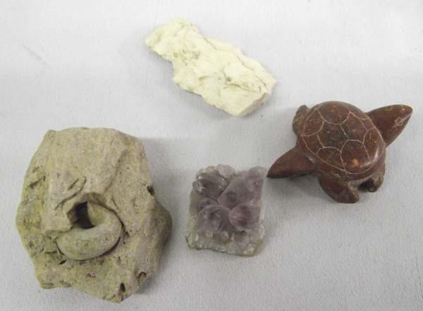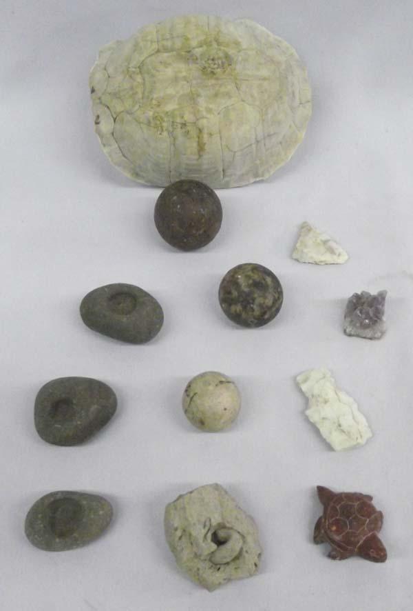 Collection of NM Findings Plus (must have needful things), desert turtle shell, Indian gaming ball, amethyst crystal, rock formations, fossil, 2 broken arrowheads, turtle fetish (broken), iron ball, Bennington Marble Shooter, largest piece (turtle shell) measures approx. 5'' x 4''. Buyers Pay Actual Shipping and Handling Charges(see terms and conditions for more information)