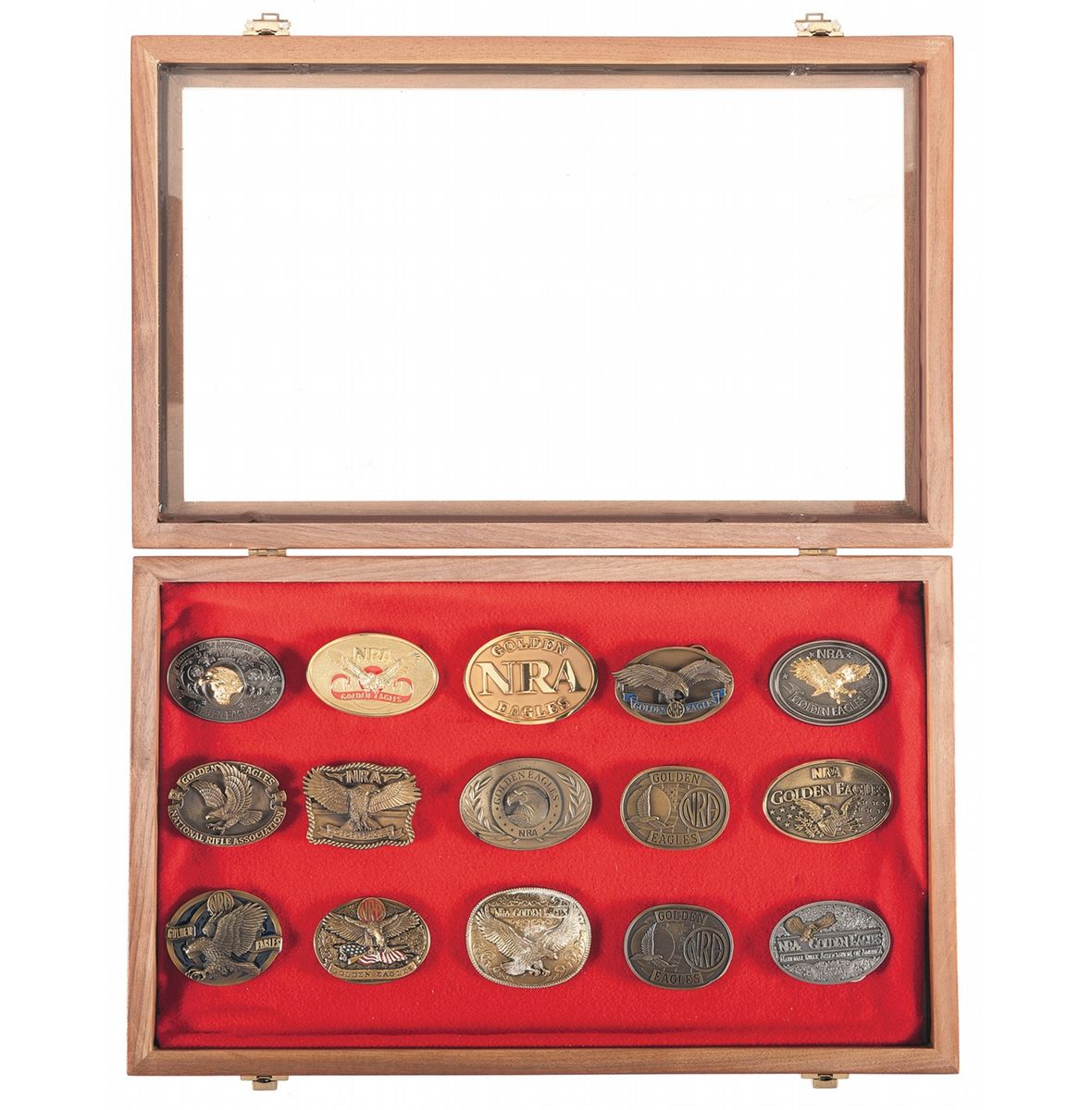 15 various NRA Golden Eagles belt buckles (8 have boxes), with a 21 1/2"x13 1/4" display case.