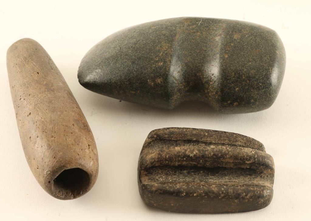 Including a fine 5" river stone Axe head, 4.5" stone smoothing pipe, and a 2.75" by 2" double arrow straightener. All from circa 750-1100 A.D.