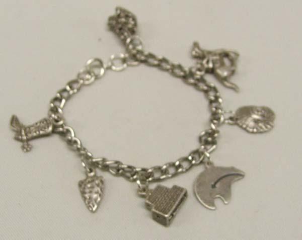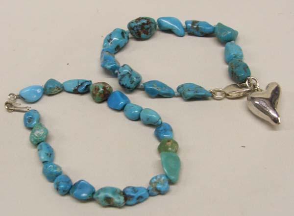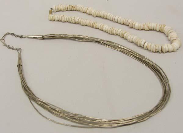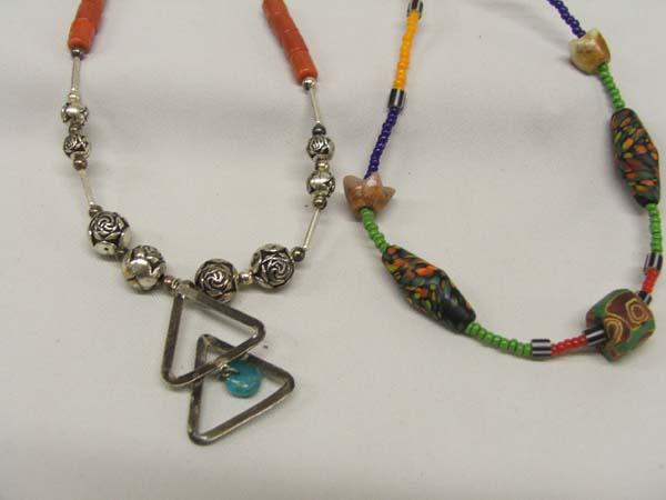 Collection of Native American Jewelry Plus. Charm Bracelet, 2 Turquoise Nugget Bracelets, Liquid Silver Necklace, 2 trade bead necklaces, choker of puka shells, and contemporary bracelet hallmarked Lori Bonn. Longest Necklace measures 26'' SHI $15