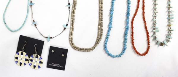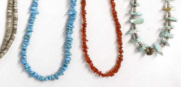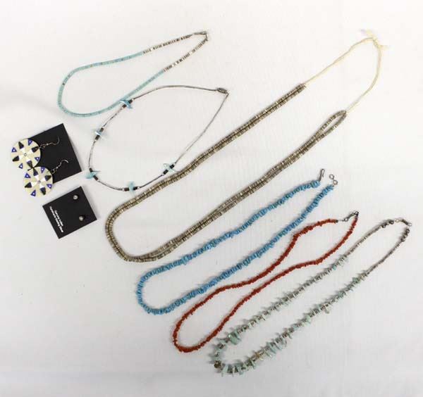 Collection of Native American Jewelry, longest necklace measures 30''L end to end, includes 6 necklaces and 2 pairs of earrings, includes shell and turquoise heishi, turquoise nuggets, coral, and sterling silver