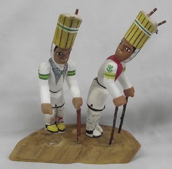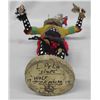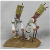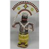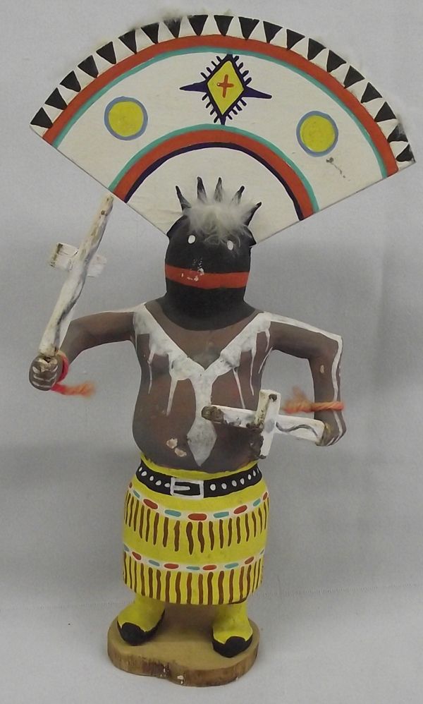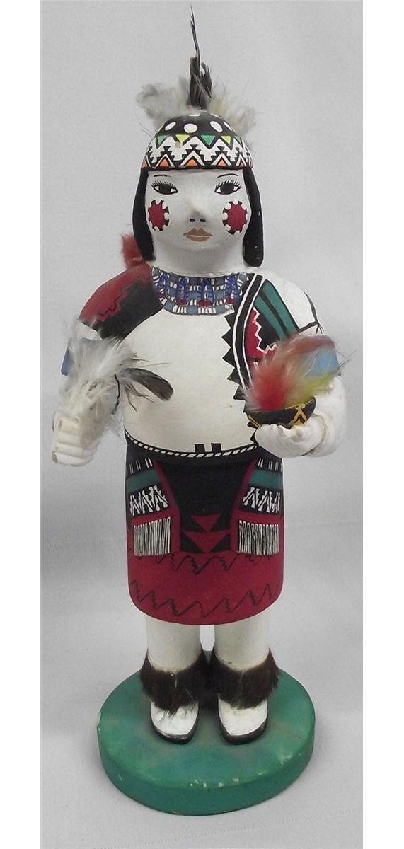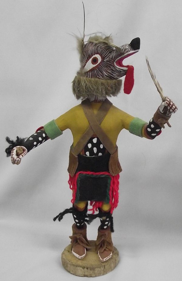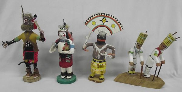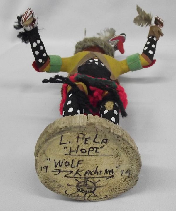 Collection of Native American Kachina Dolls, largest is Zuni Dancer at 10''H, #1 Navajo ''Apache'' Gan Dancer #2 San Juan Dancers #3 Hopi Wolfman signed on bottom ''L. Pela 'Hopi' Wolf Kachina 1979'' with Sun Face Hallmark, missing item in right hand #4 Zuni Dancer, all are embellished with feathers, yarn, and leather