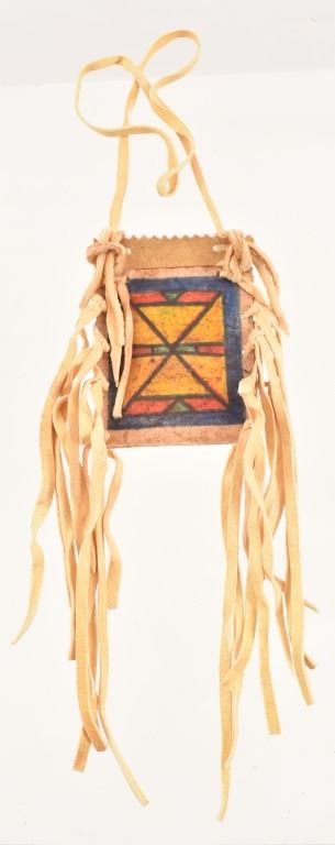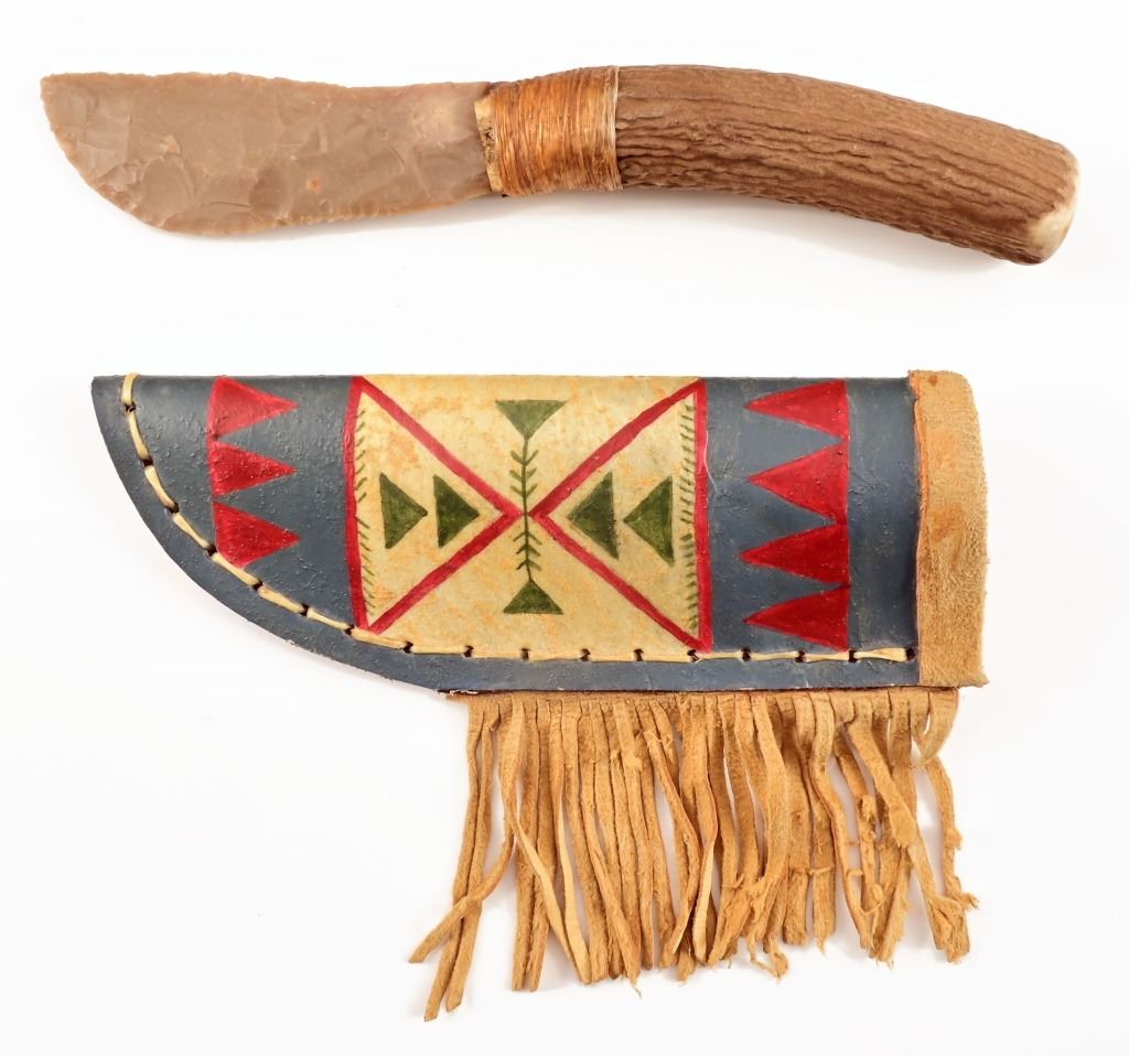 (6) Items in Glass Top Case. Man Made Knife in Sheath. Pouch Contemporary