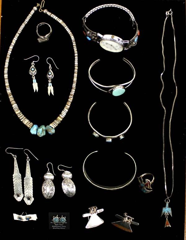 Collection of Native American Navajo Jewelry, the frog ring and screwback earrings are not Native American however they are sterling, includes turquoise, coral, and jet, some vintage, some chip inlay turquoise and coral, includes watch band, pendant necklace, shell heishi and turquoise nugget necklace, 6 pairs of earrings, 3 cuff bracelets, 2 rings, longest is pendant necklace with the sterling chain measuring 20''L end to end and pendant measuring 1.75''L