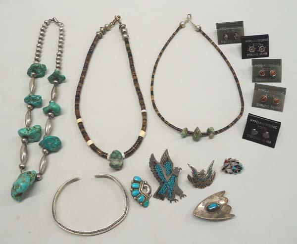 Mixed Lot Navajo Silver Turquoise Jewelry. 3 Necklaces, longest measures approx. 16'' with a 1 x 3/4'' turquoise nugget. 5 pair pierced earrings, 3 pins, 1 clip on earring, 1 belt tip, 1 bracelet. Buyers Pay Actual Shipping and Handling Charges(see terms and conditions for more information).