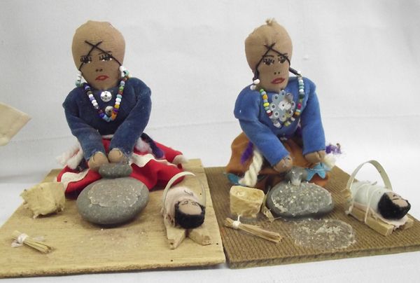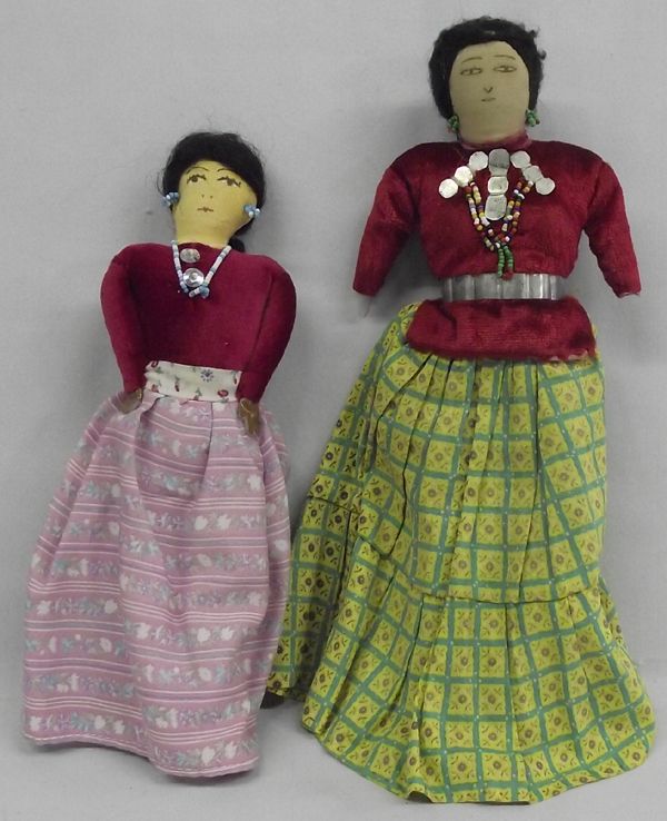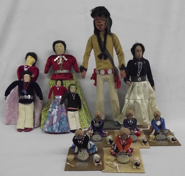 Collection of Navajo Dolls, largest measures 15''T, 5 cloth bodied dolls in traditional dress, 2 carved wooden dolls in traditional dress, 5 kneeling dolls grinding corn on metates