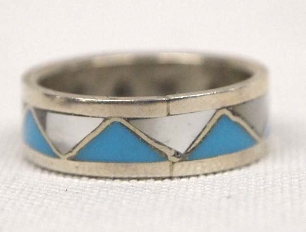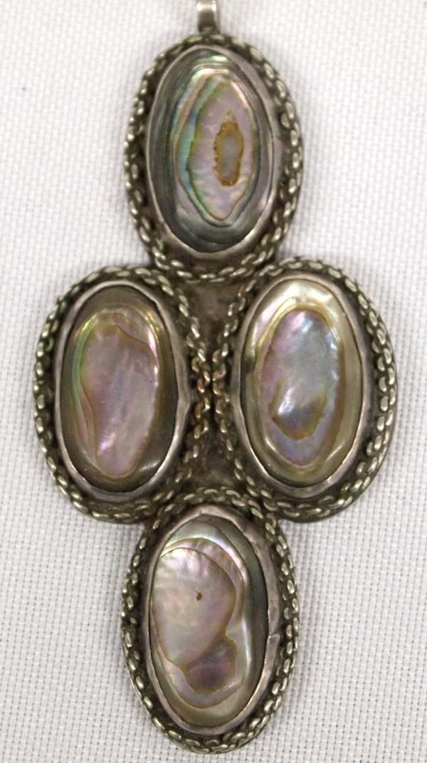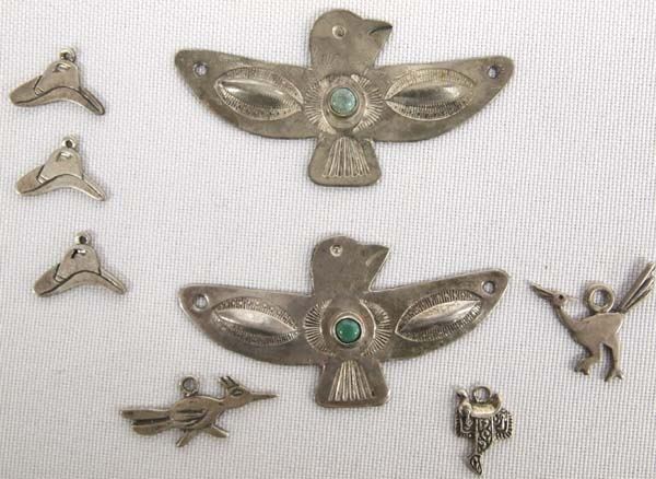 Collection of Native American Navajo Sterling Silver Jewelry, #1 Antique Navajo Sterling Silver Abalone Pendant measures 3'' x 1.5'', #2 Navajo Sterling Turquoise Mother of Pearl Inlay Ring, size 7, #3 Two Sterling Silver Pendants, largest 1'' x 2'', #4 Six Cowboy Western Sterling Silver Charms, all are marked Sterling, Roadrunner is the longest measuring .75'' x .75'', 55.34g in total wt.