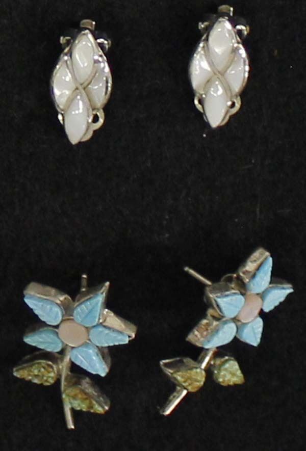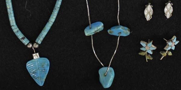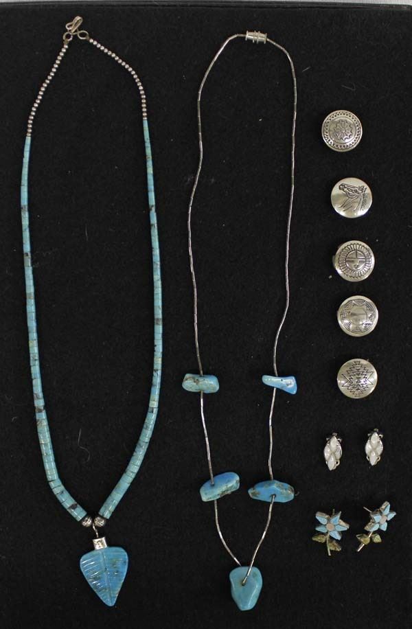 Collection of Native American Navajo and Zuni Sterling Silver Jewelry, includes: 1. Navajo Graduated Turquoise Heishi and Carved Turquoise Leaf Pendant Necklace, silver bead accents and clasp 2. Navajo Liquid Silver and Turquoise Nugget Necklace, longest measuring 22''L end to end with largest nugget measuring 1''L 3. Sterling Silver Button Covers 4. Zuni Sterling Mother of Pearl Clip-On Earrings 5. Zuni Sterling Turquoise and Mother of Pearl Flower Earrings