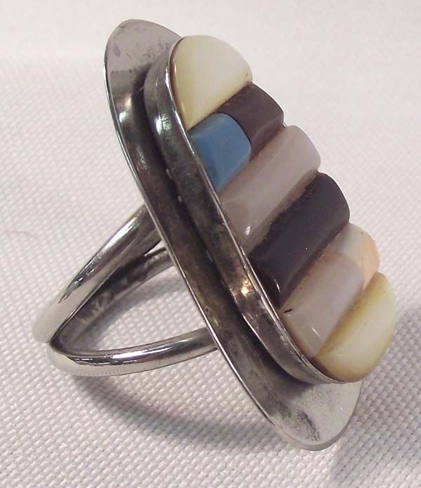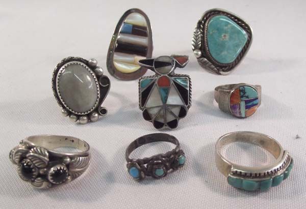 Collection of Native American Navajo and Zuni Rings, 8 rings, some hallmarked: 1 stamped AF, 1 stamped TSF Begay which is Calvin Begay, and one stamped RG, and 2 stamped sterling, stones include: turquoise, pink shell, mother of pearl, coral, jet, purple shell, opal, red shell, and onyx, largest is 10.5, 1 is stone to stone inlay while 2 are silver channel inlay, nice collection.