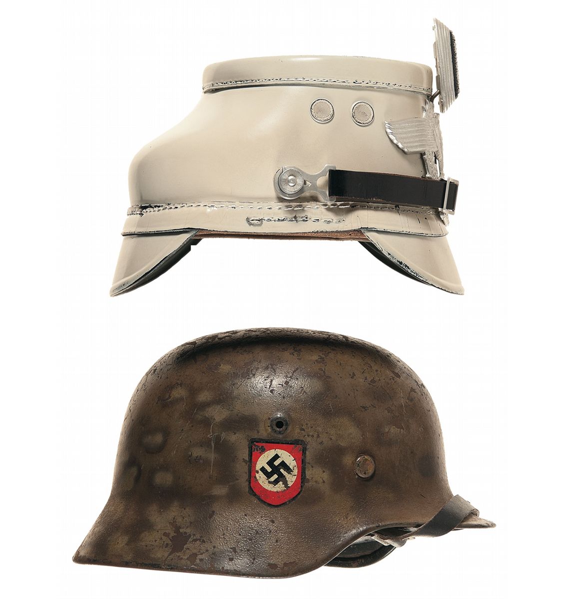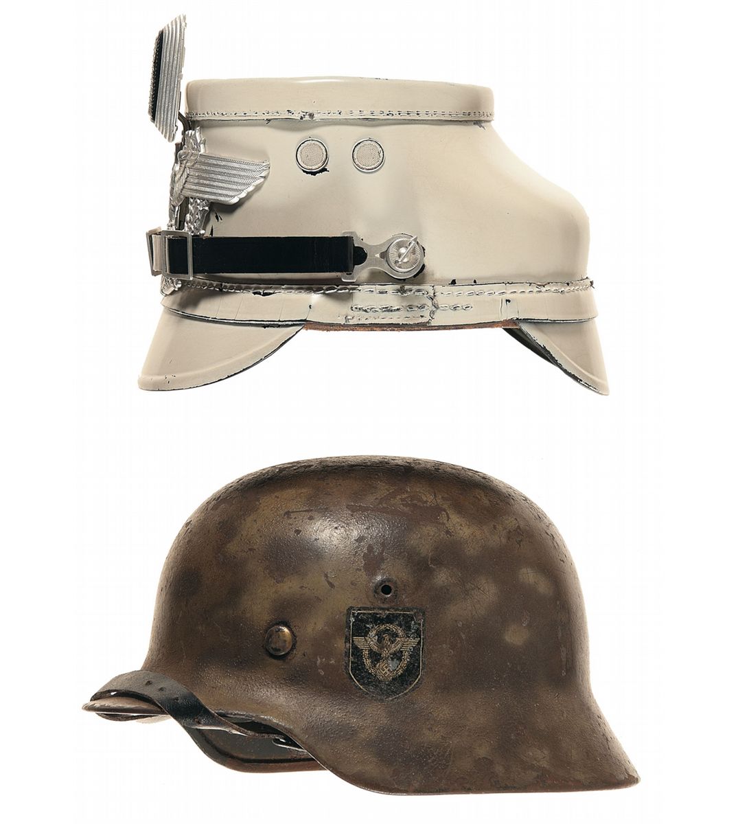 White EM/NCO police shako, camo double decal police helmet, police ID tag, police gorget. Overall very good.