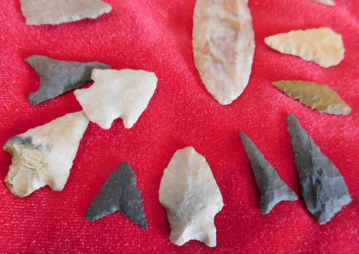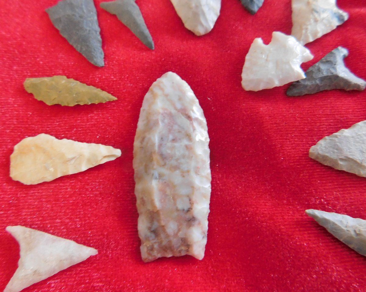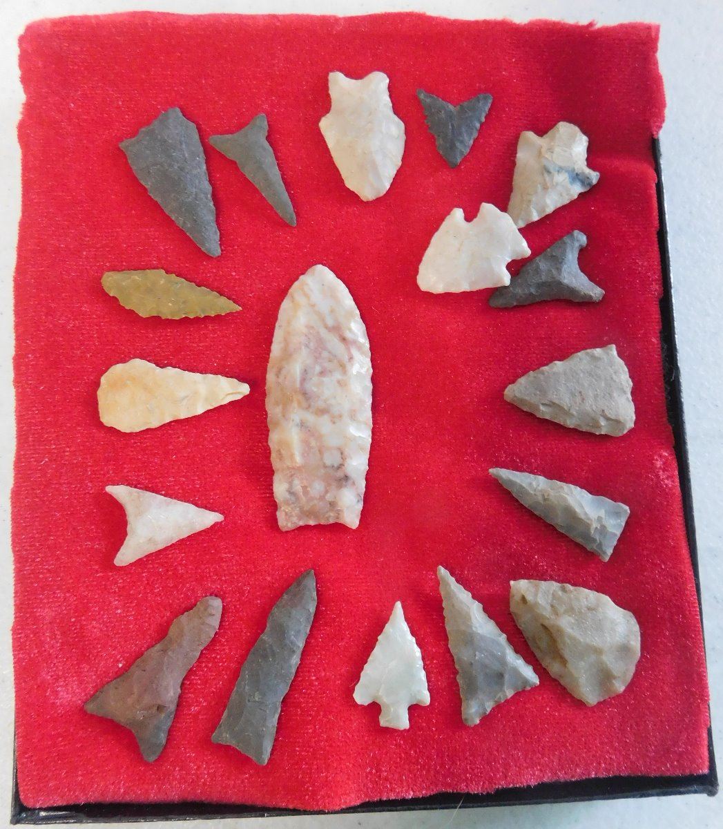 Collection of New Mexico Points, paleo to historic periods. Made of alibaster, chert and flint, the items are 1" to 2.5". Eastern New Mexico. Frame not included. Condition: Some points have chips, see images. Shipping: $20.00 w/insurance and signature.
