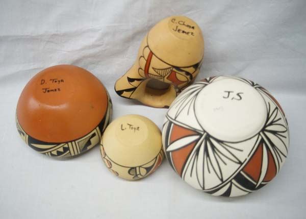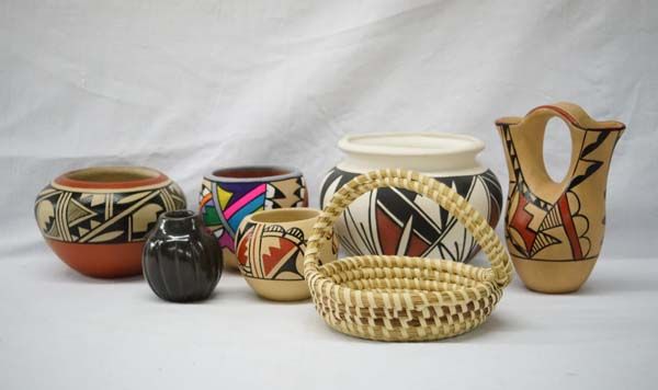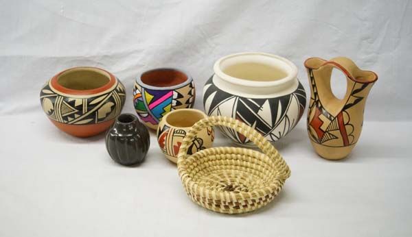 Collection of New Mexico Pueblo Pottery, 1 Basket, largest measures 4.5''H x 6''W, #1 Tohono O'odham Curved Handle Basket #2 Jemez Jar by L. Toya #3 Jemez Painted Pottery Jar #4 Santa Clara Carved Jar by Olaria Sisneros #5 Jemez Wedding Vase by C. Chosa #6 Jemez Jar by D. Toya, #7 Acoma Jar hallmarked J.S.