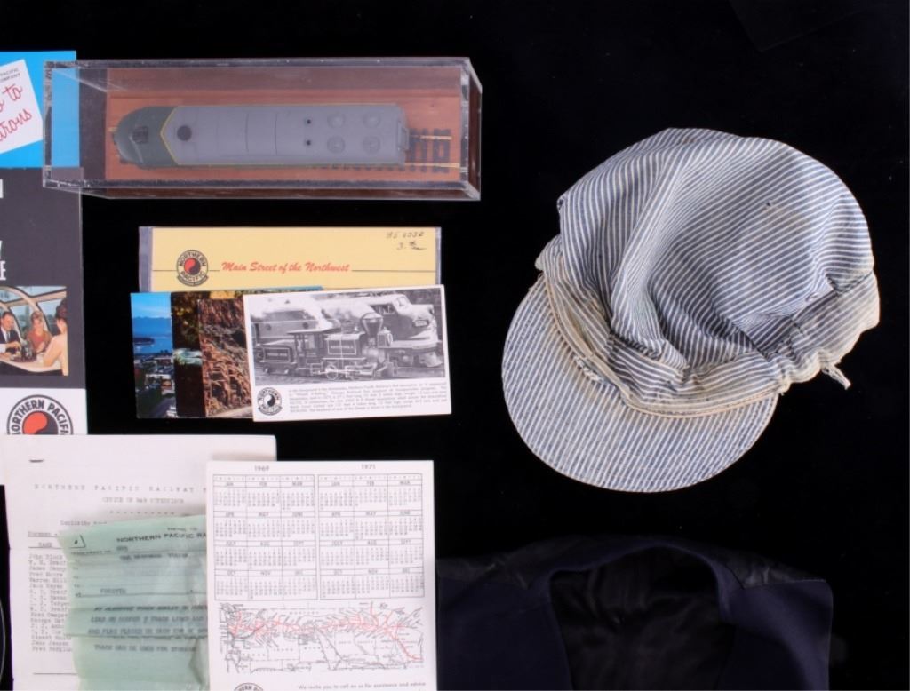 Featured in this lot is this collection of Northern Pacific Railroad ephemera. This collection shows genuine ephemera, including matches, notepads, and manuals. This collection features two coffee cups and a deck of cards and a contemporary Northern Pacific Railway sign. There is a genuine conductor vest with a pin stripe, Northern Pacific Railway cap and railroad napkins. There are five Northern Pacific Railroad books in this collection. The collection also includes a beautiful Northern Pacific Railroad rail car in a stand and protective covering. The condition of this collection is good, with no obvious signs of damage and some wear to the railroad clothing. The measurements of this collection range from 15" x 9 1/4" x 5 3/4" to 3 1/2" x 2 1/4 x 3/4".