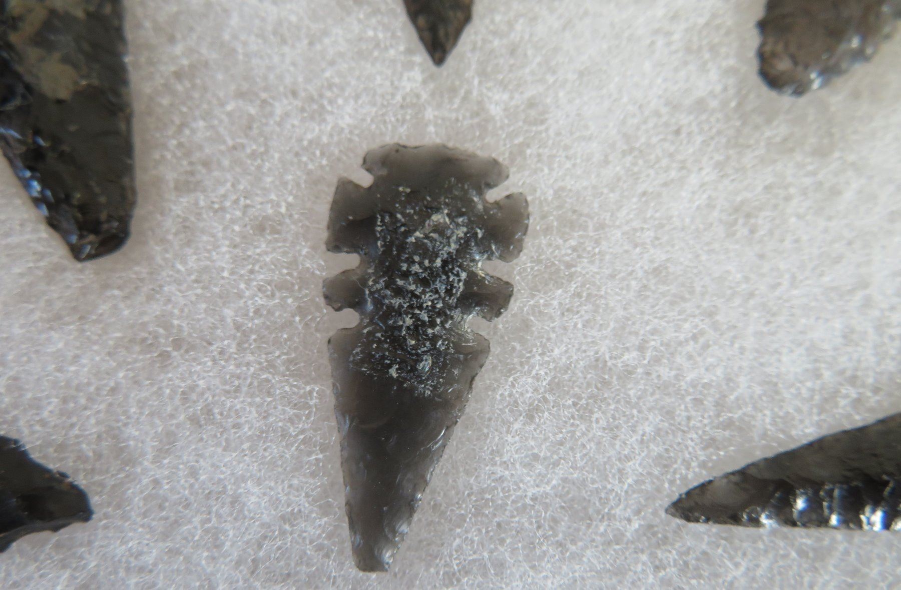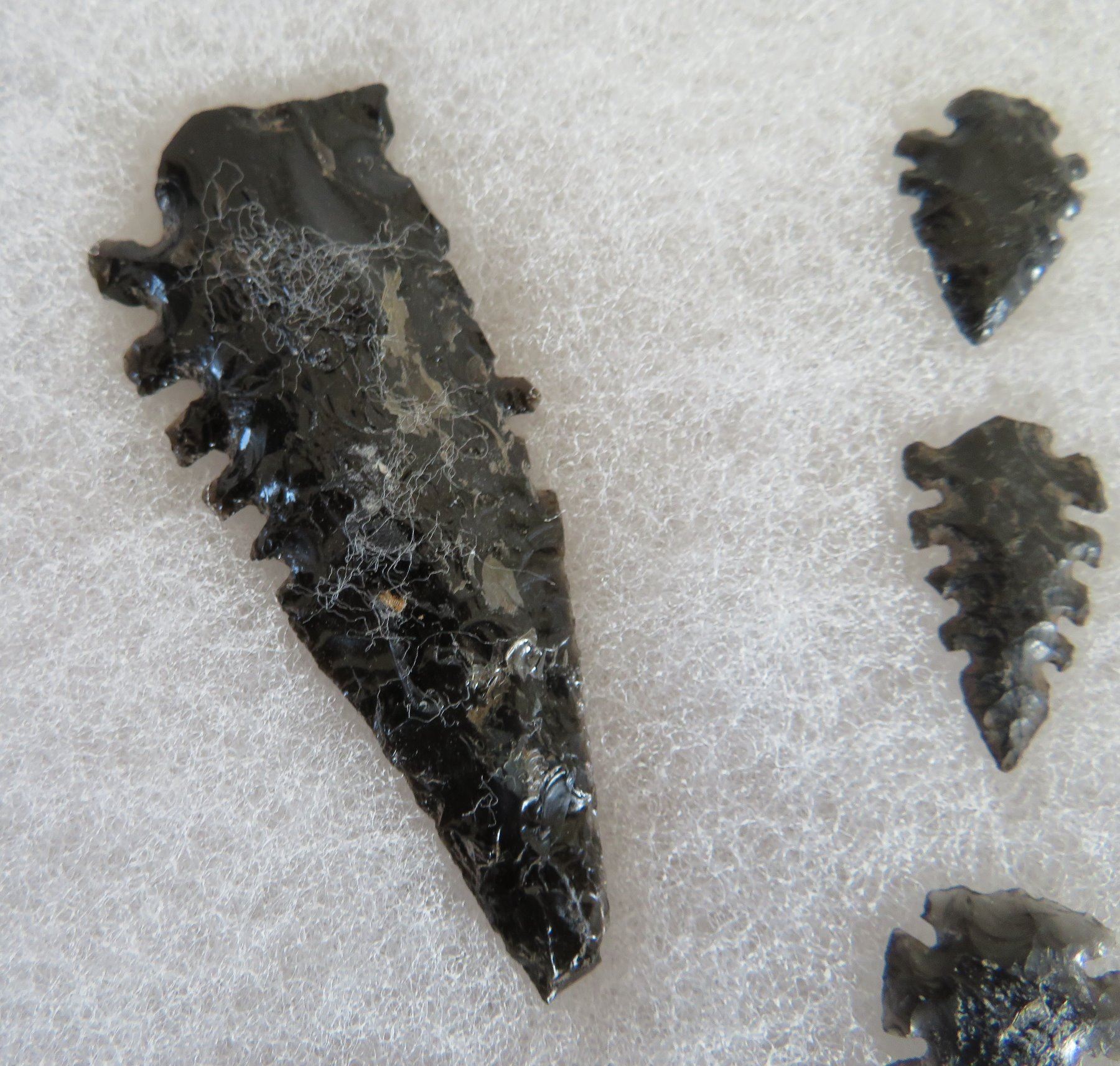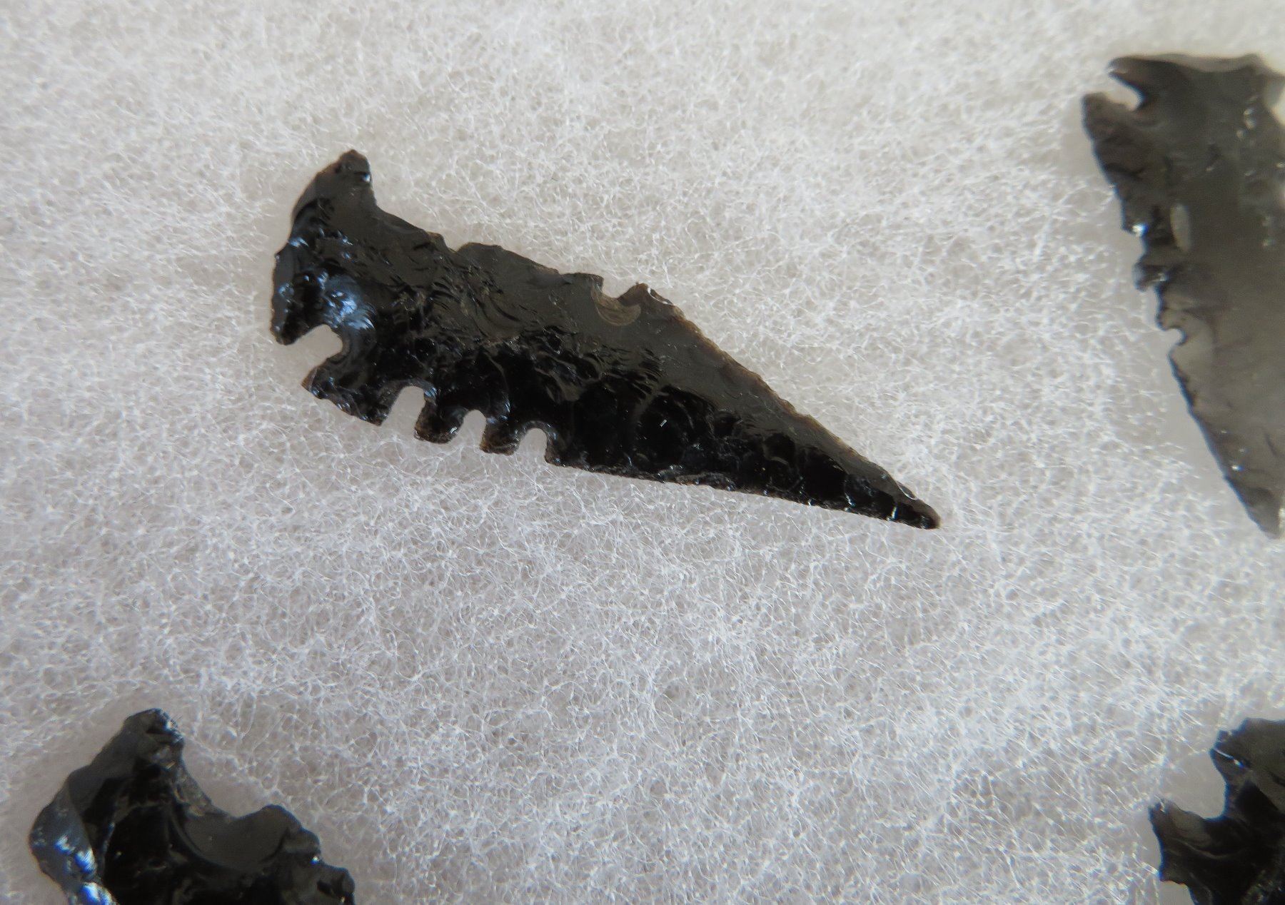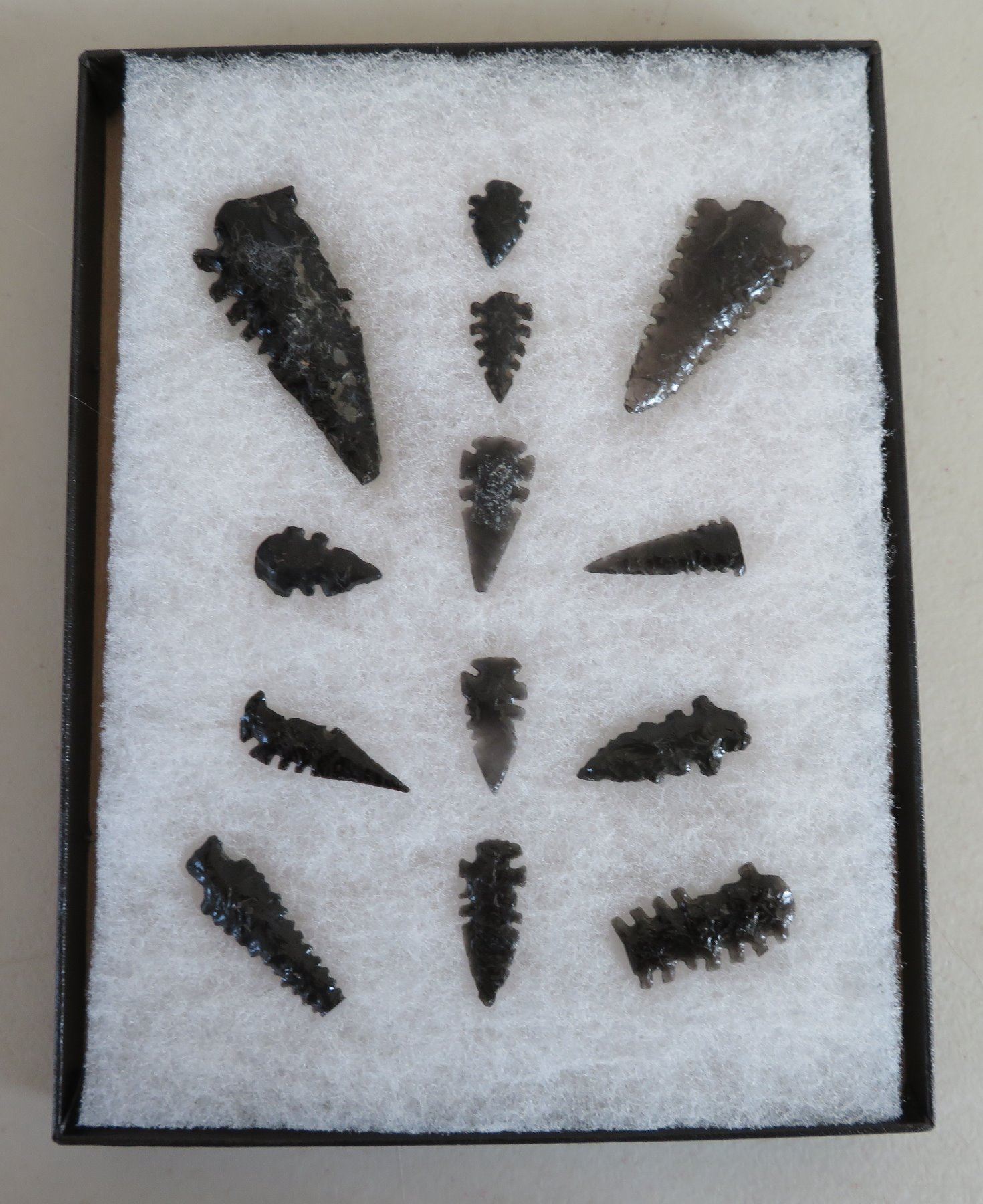 Collection of Obsidian Artifacts, pre-historic items. Made of obsidian, the largest measures 2 1/2". Stockton, California. Very rare serrated Stockton points. Frame not included. Condition: Many damaged, see images. Shipping: $25.50 w/insurance and signature, due to value.