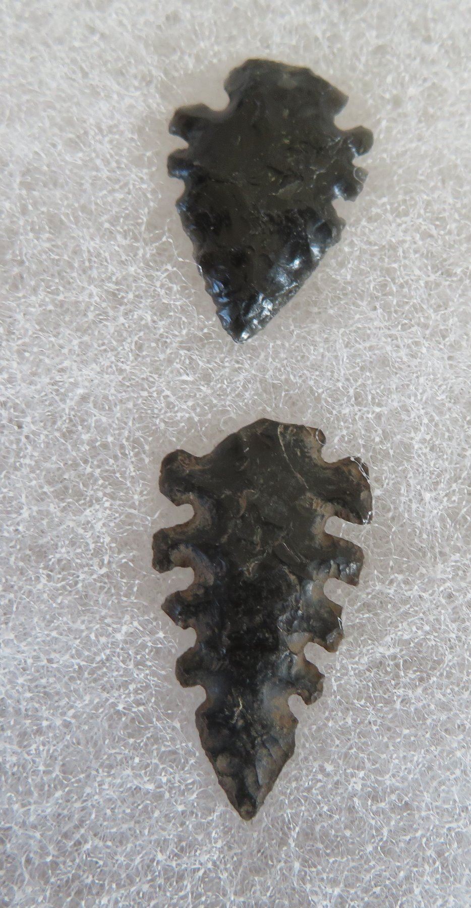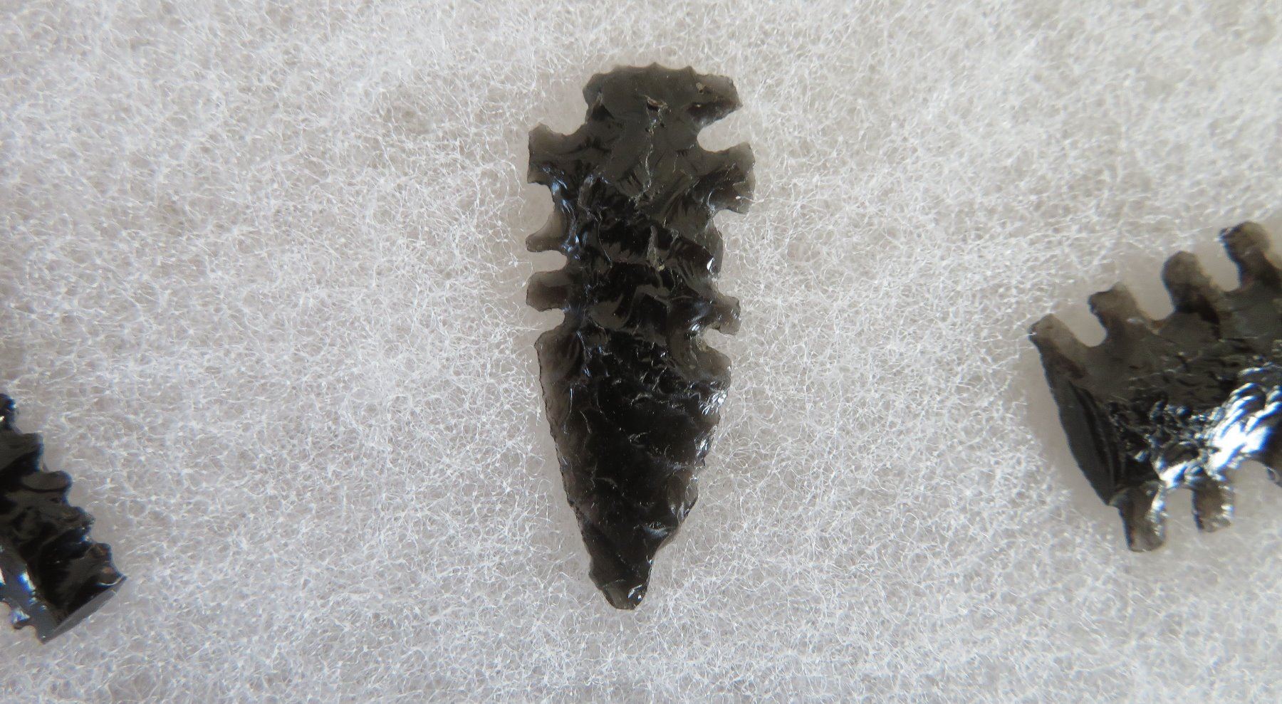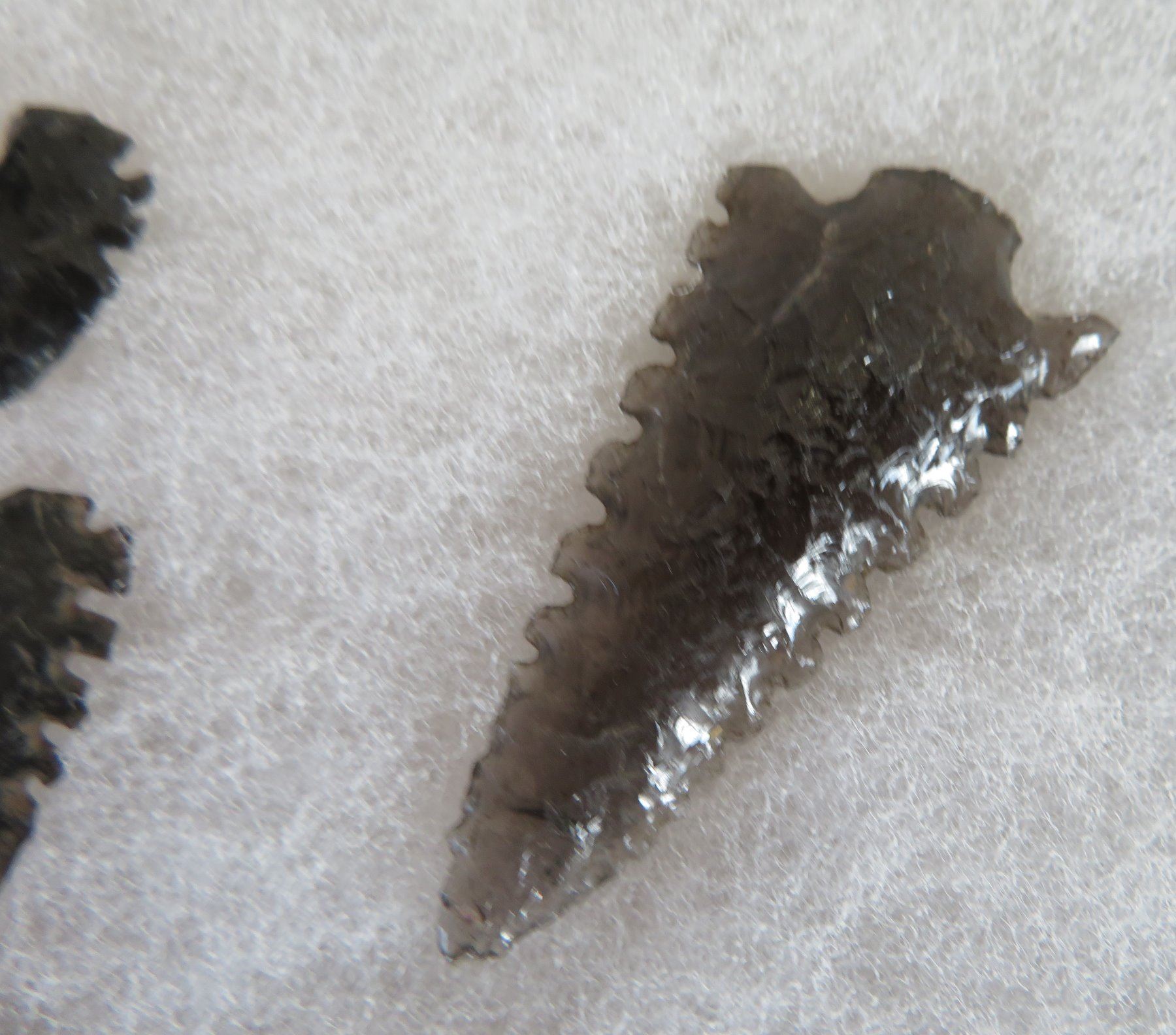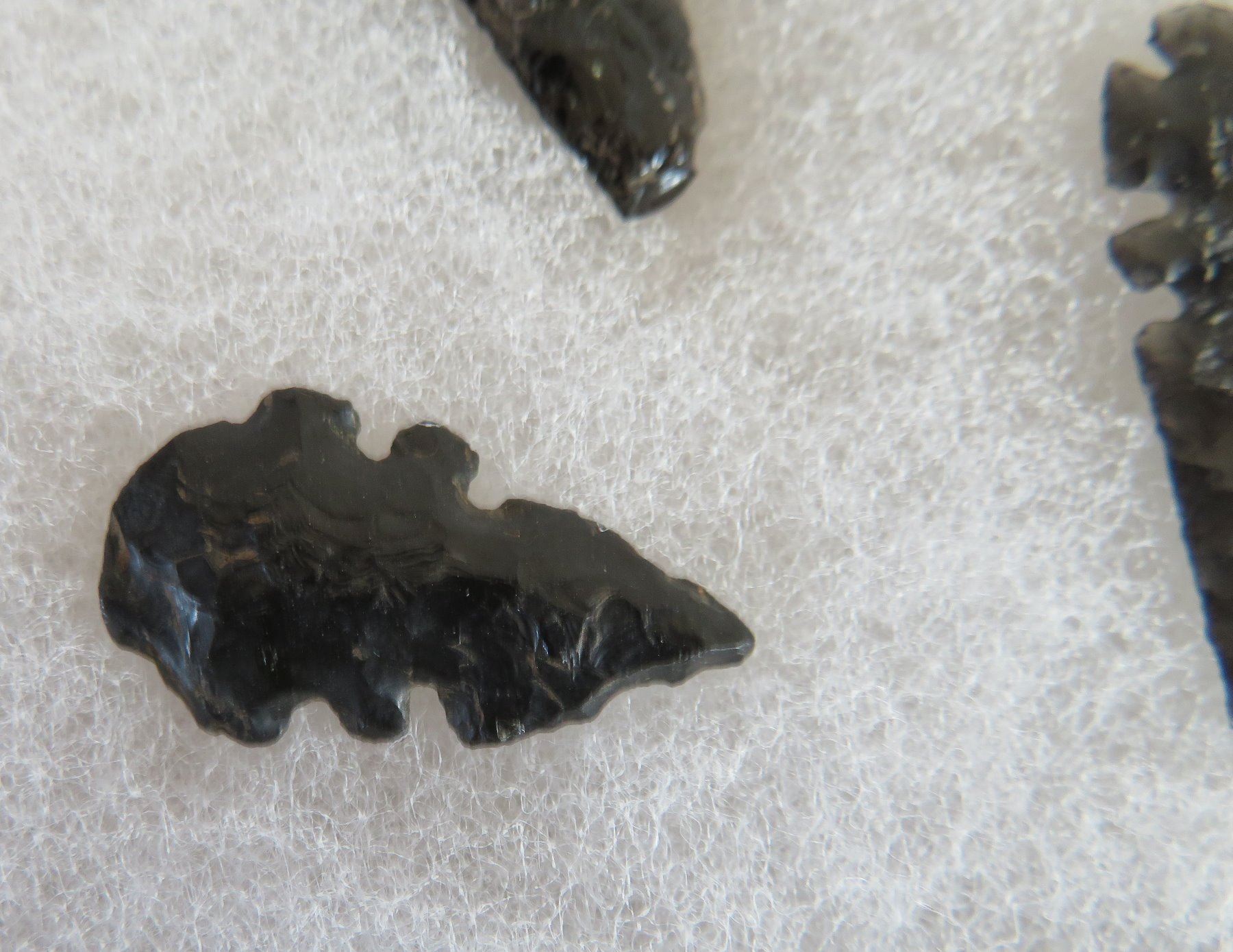 Collection of Obsidian Artifacts, pre-historic items. Made of obsidian, the largest measures 2 1/2". Stockton, California. Very rare serrated Stockton points. Frame not included. Condition: Many damaged, see images. Shipping: $25.50 w/insurance and signature, due to value.