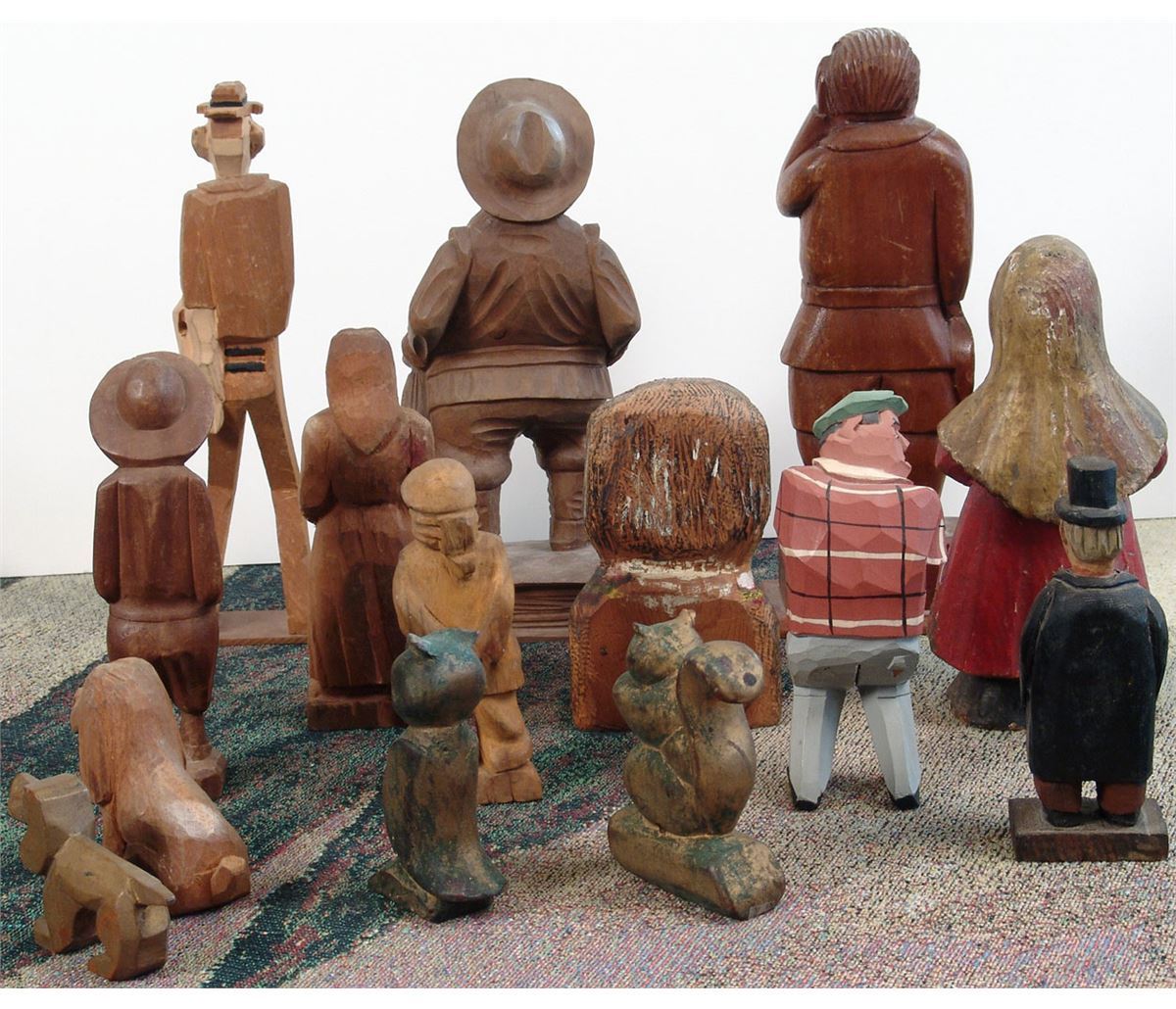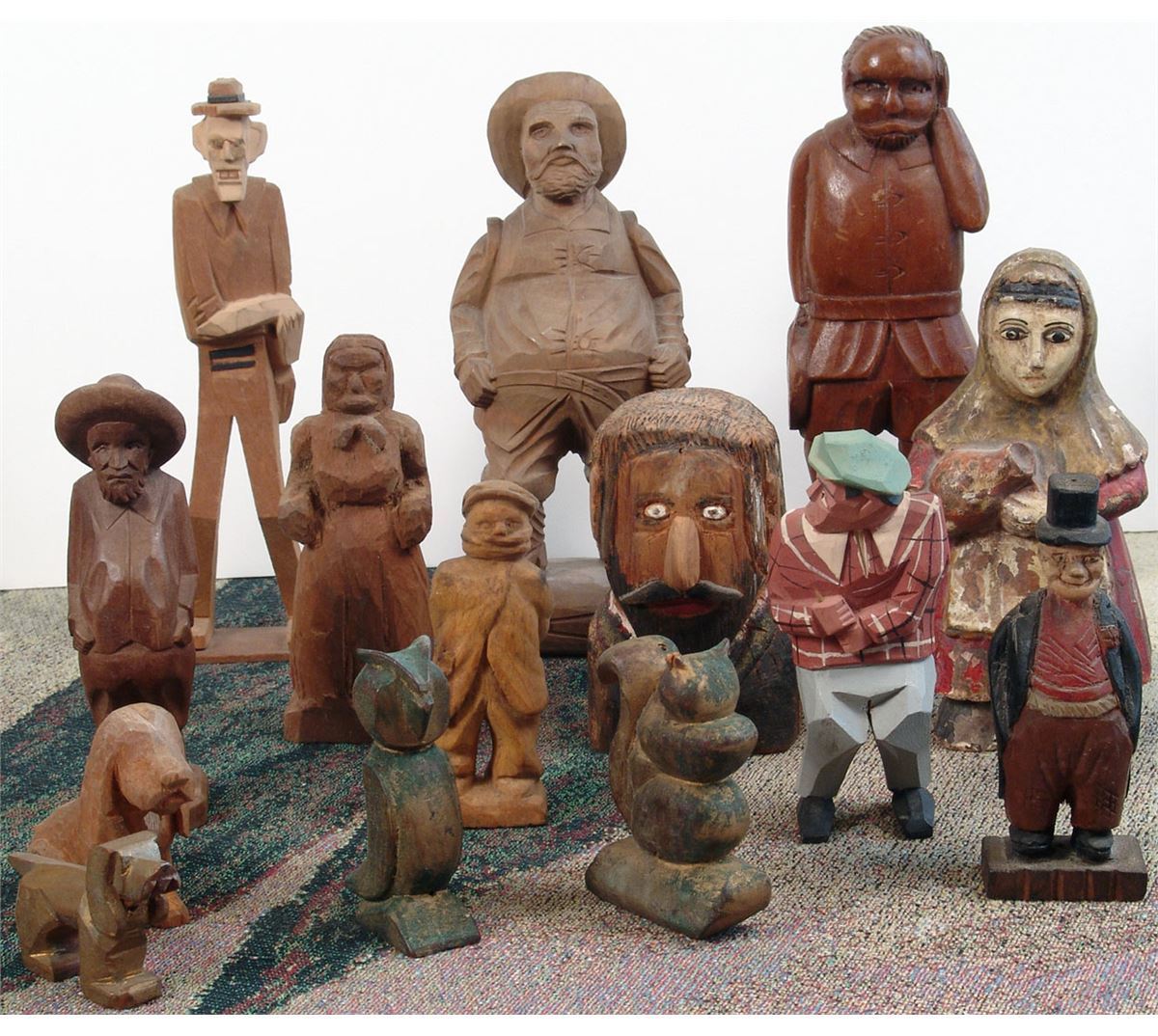 This is a collection of 14 old hand-carved wood folk art/primitive pieces that we acquired from a local collector. We believe their years of creation range from the 1940s to the 1960s. Contact us with any questions. SIZE: Range from approx. 4" to 11 1/2" high. Most are around 2 1/2" to 3" wide.