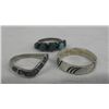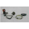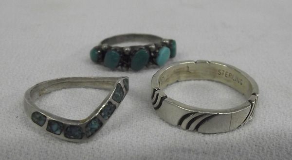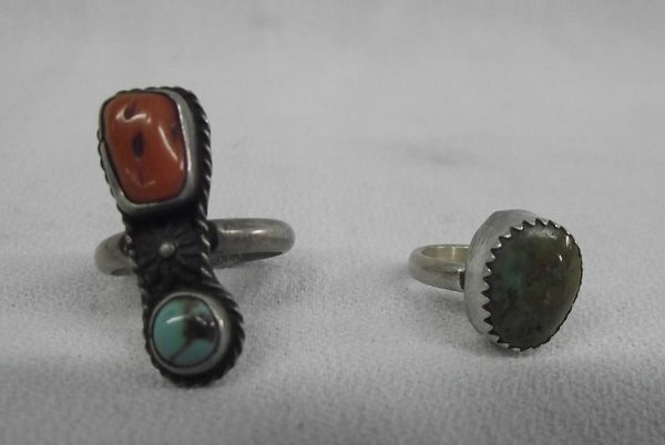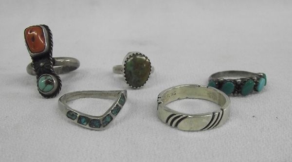 Collection of Old Pawn Rings. These unique rings are in sizes ranging from 1.5 to 8. #1 Coral ring in traditional style setting. #2 Blue-green Oval Cabochon in sawtooth bezel setting. #3 Turquoise Carbochon Sterling ring. #4 Carved Sterling band stamped sterling #5 Turquoise inlay V-shaped ring.