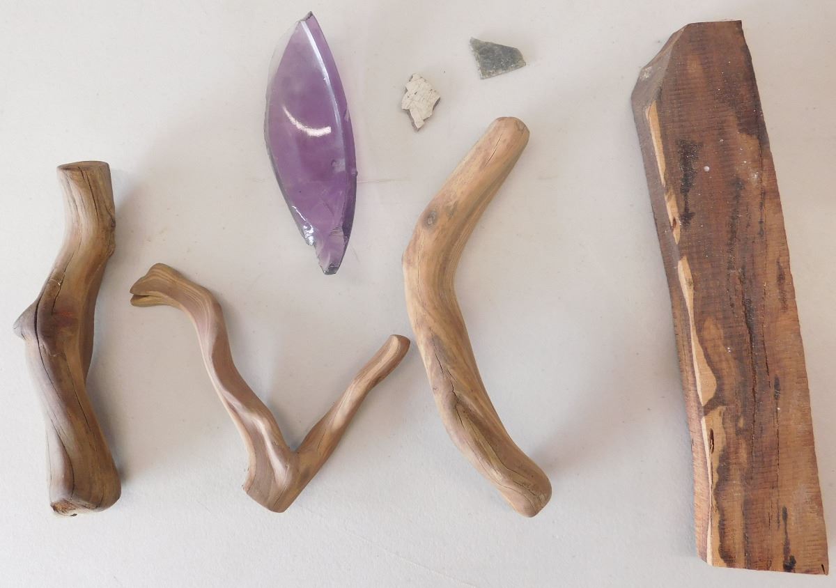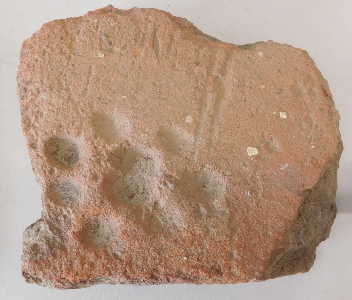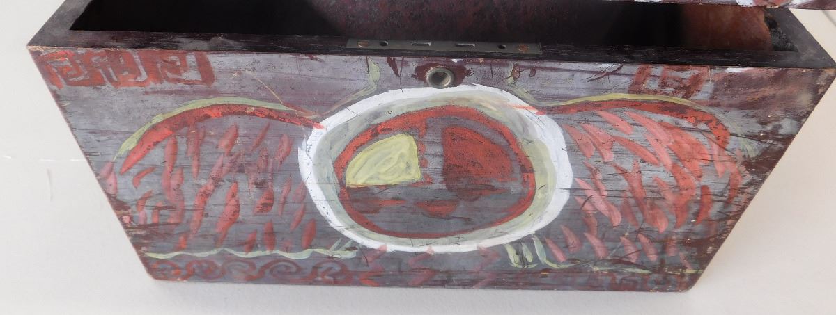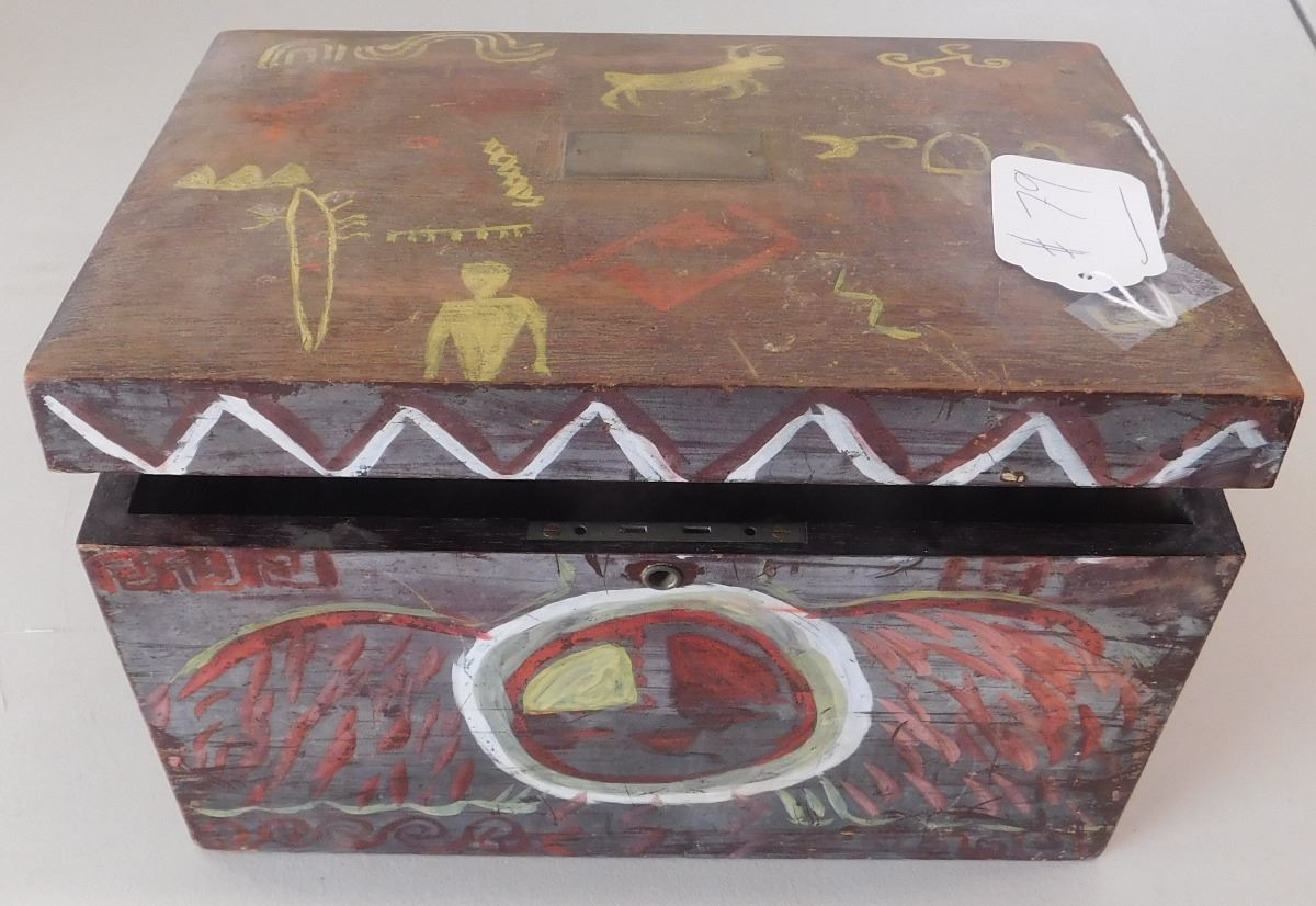 Collection of Old Spanish Relics, circa 18th century. Made of iron, adobe, and wood; the iron pot fragment is 9" x 8", while the adobe fragment is 7" x 8". From San Diego County, Calif. The adobe fragment has the footprint of a mountain lion or a wolf on it. Old iron pot was found with it. The box has no key and has Native American-style symbols painted on. Broken arrowhead from Spanish wine bottle. Condition: All damaged, box is ok, see images. Shipping: $50.00.