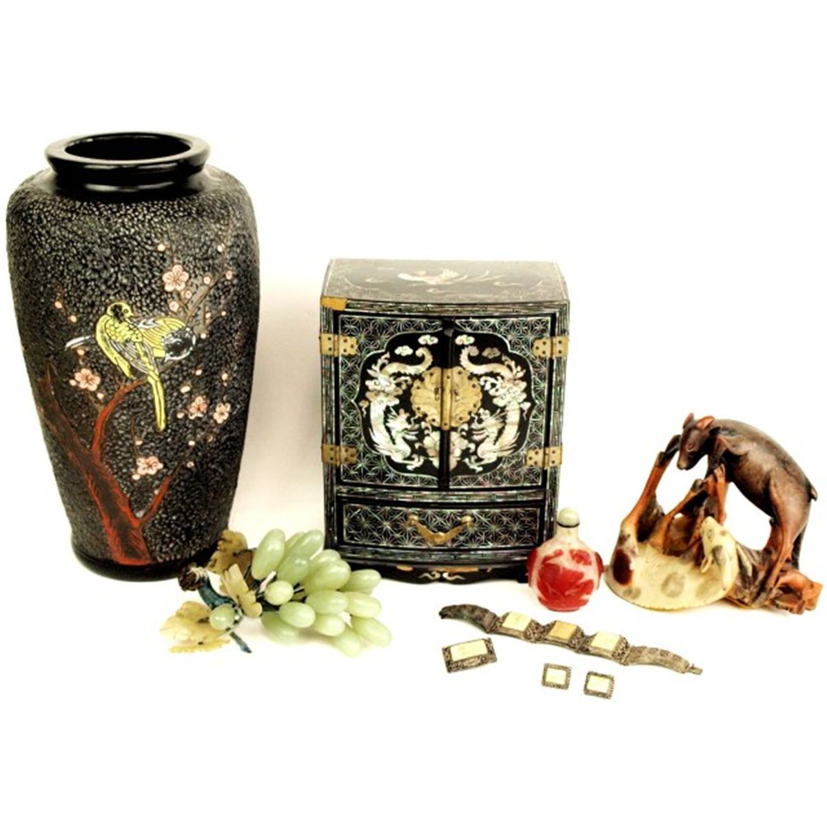 Collection of Oriental includes mother of pearl inlaid jewelry box. 8 1/2' tall, stone carving of fighting ram unmarked 5" tall, antique snuff bottle, carved jade grape cluster, ivory on silver bracelet, earrings and broach with scrimshaw panels, center panel missing on bracelet and Japan marked black pottery vase 12".
