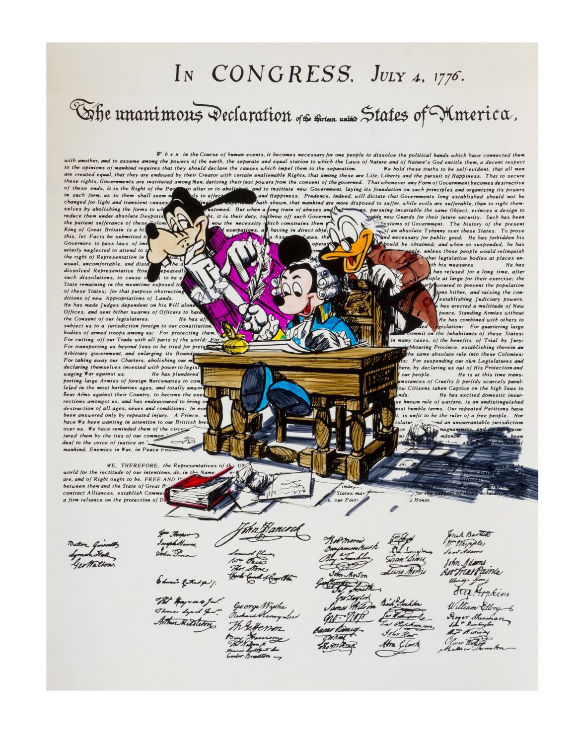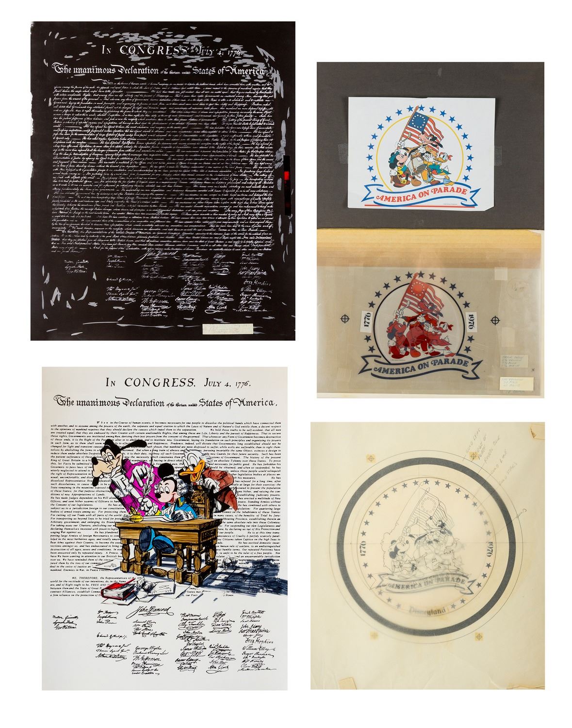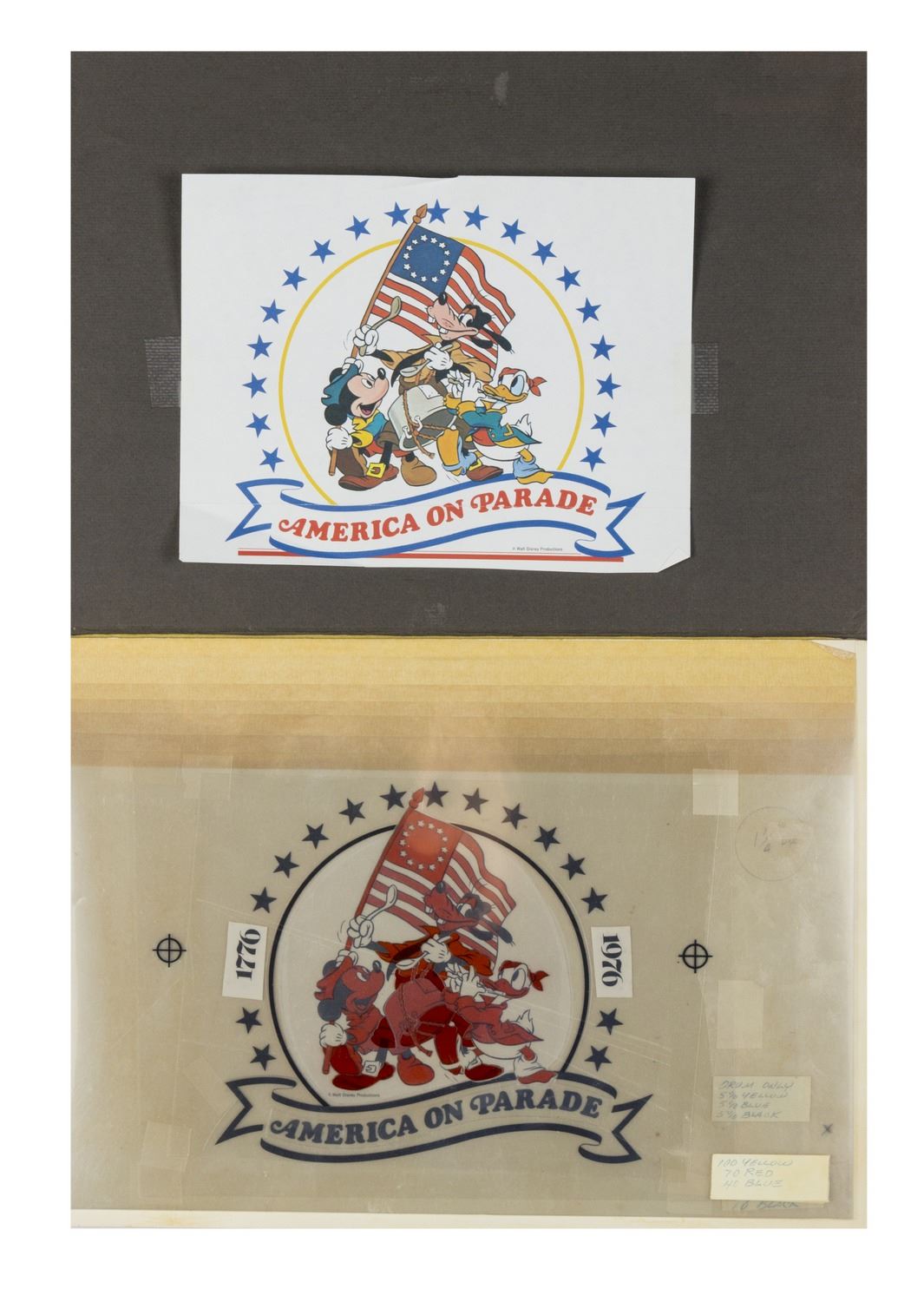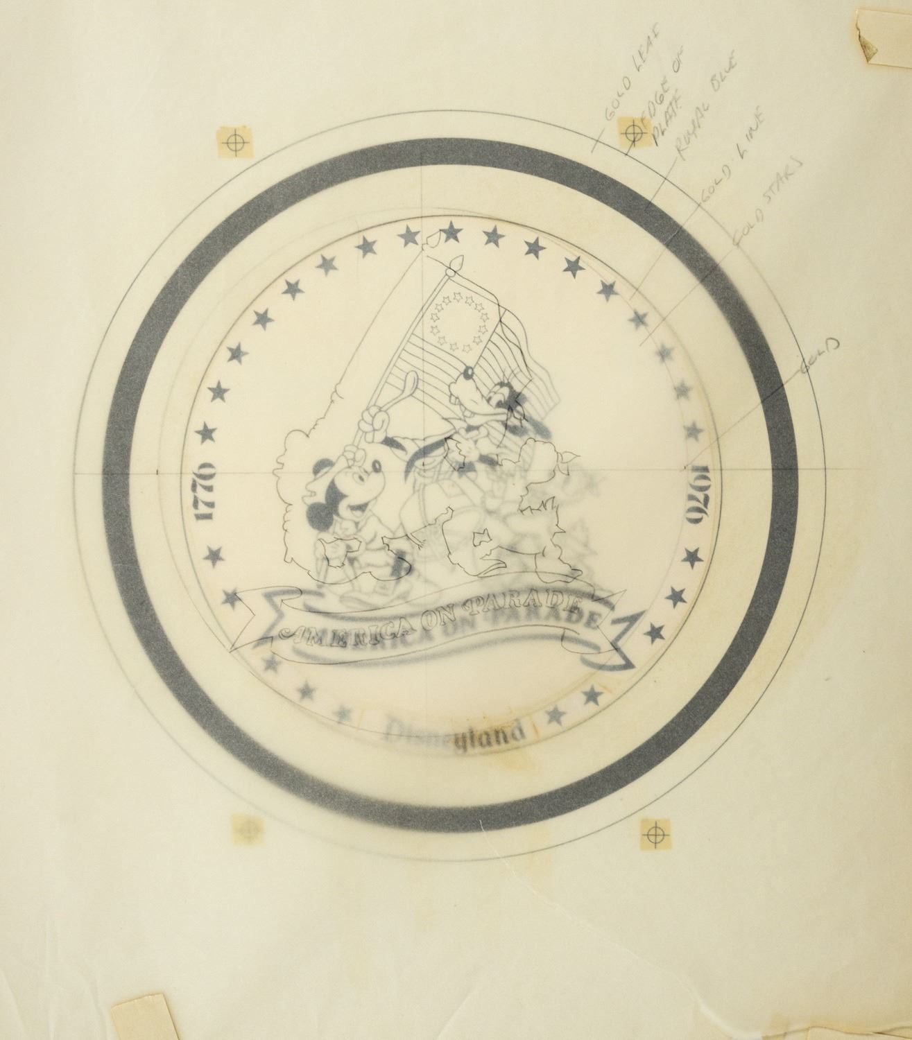 (Disneyland, 1976) A large collection of developmental artwork used to design souvenirs and promotional materials for Disneyland's "America on Parade" events. This set includes original drawings, photostat prints, film negative layers, and a final version of a souvenir plate that some of the developmental artwork was used to create. These items are in very good condition overall with some expected wear from use.