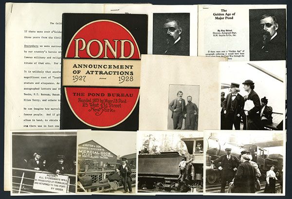 New York, "Pond Announcement of Attractions 1927-1928 The Pond Bureau", Catalogue of lectures and presenters in VF condition, 5 unpublished photos by James B. Pond featuring Mark Twain, 1) Mark Twain on the Seattle-Tacoma boat S.S. Flyer (1895), 2) Mark Twain and his nephew aboard the S.S. Flyer (1895), 3) Mark Twain sailing to Australia (1895), 4) Mark Twain riding in Locomotive engine (1895) (Hawaii), 5) Twain being interviewed on Columbia River ferry Portland, Oregon (1895). Mark Twain and G. Cable photograph (1884) on cardboard. Also included a Cyril Clemens (Samuel's Son), signed letter on his personal letterhead as President of the International Mark Twain Society, VF.