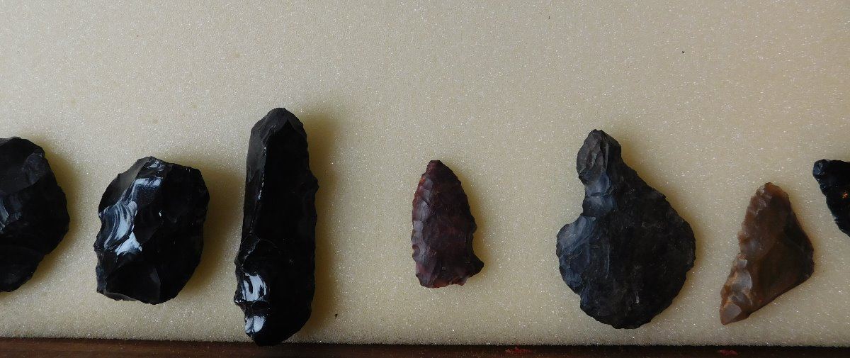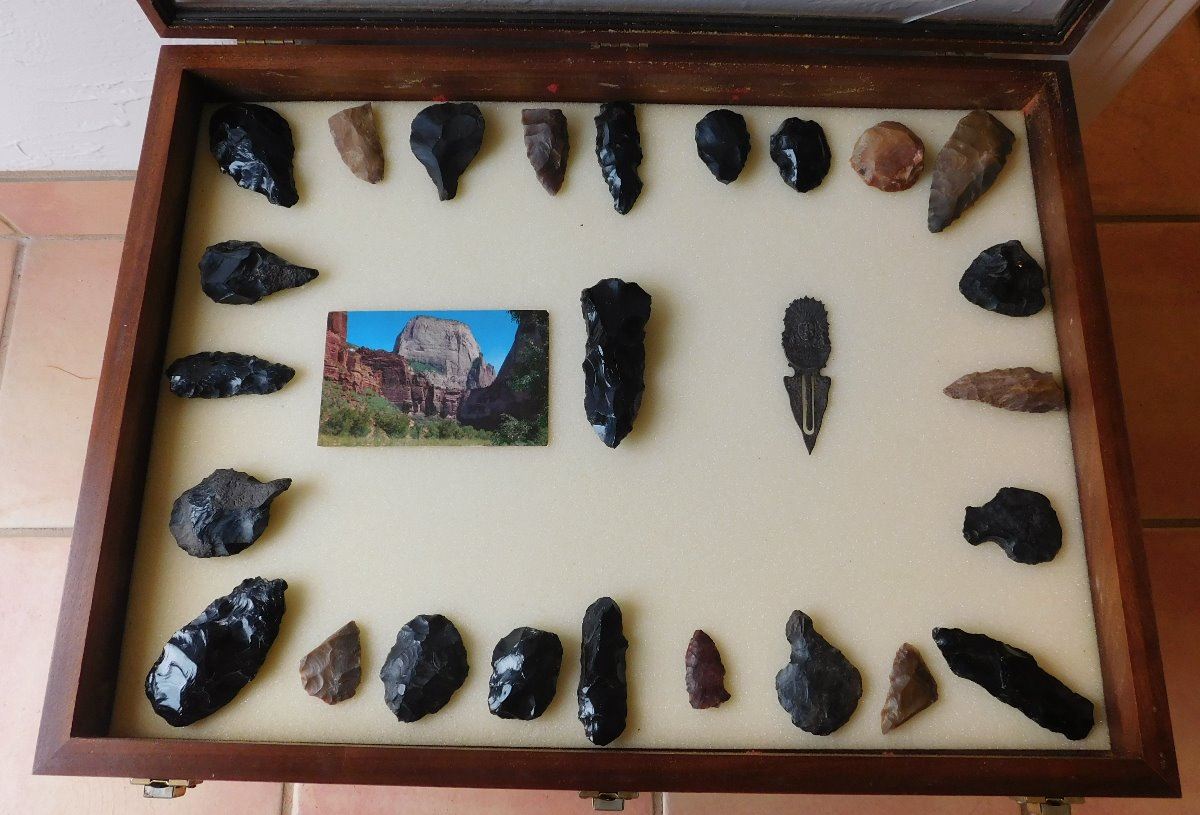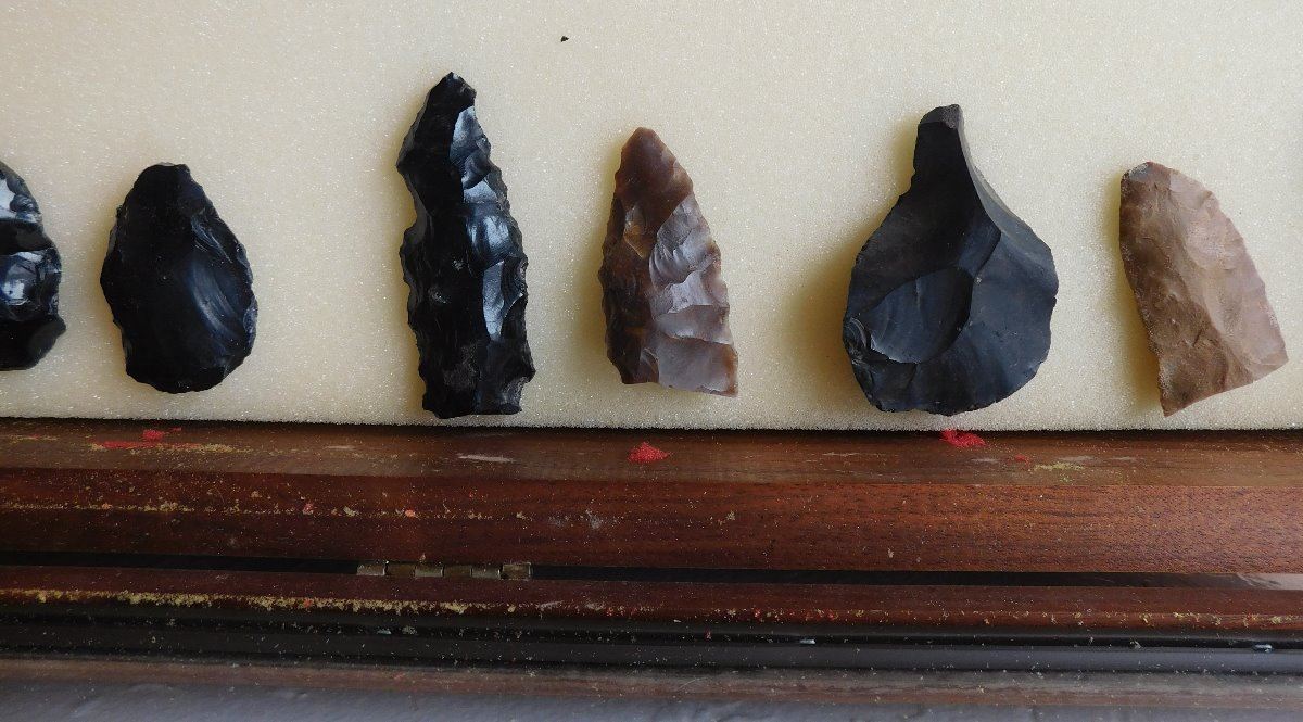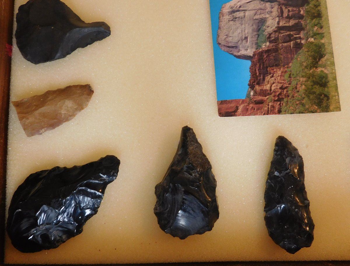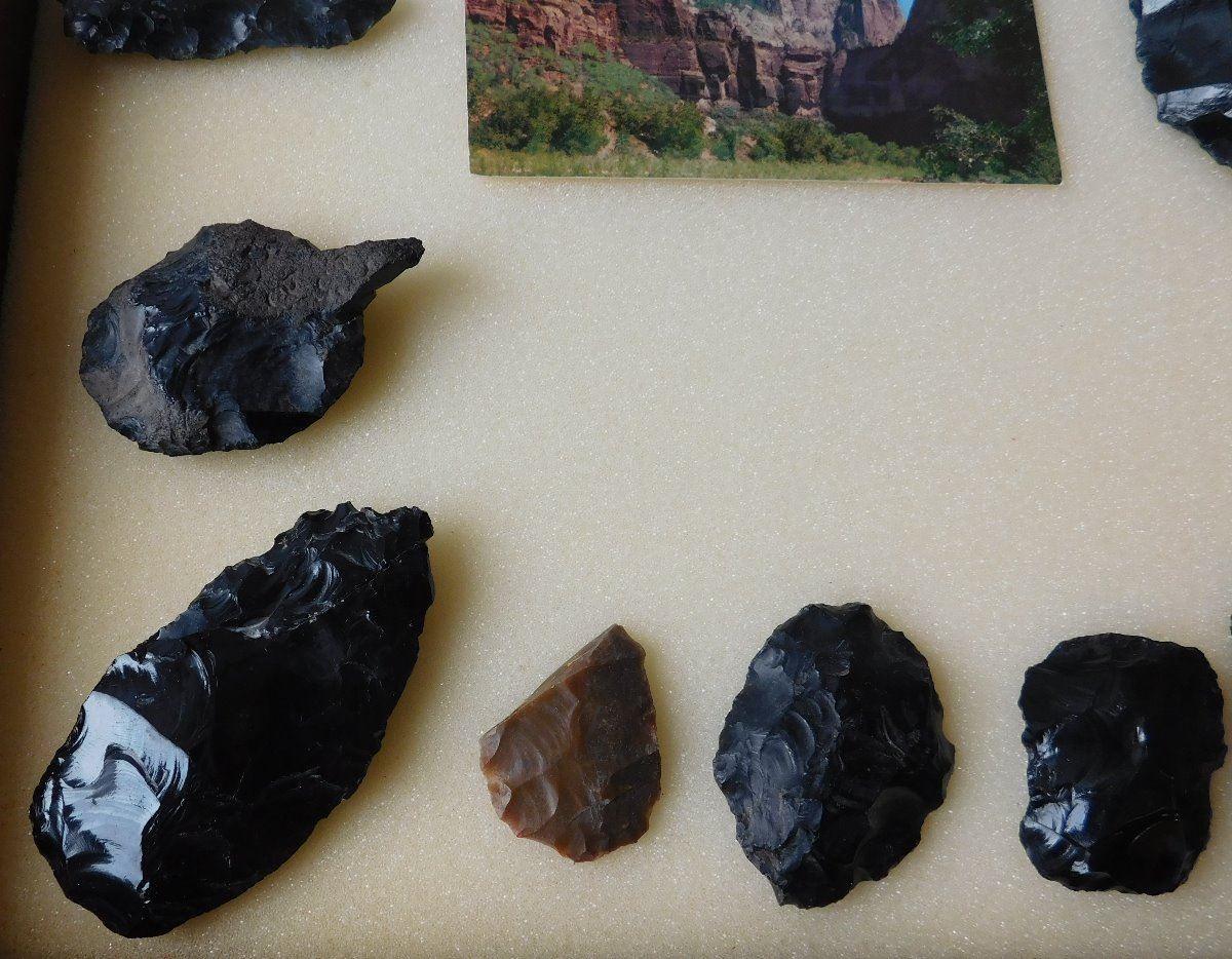 Collection of Paleo Artifacts, circa 10,000 years old. Made of obsidian, chert and jasper, the items are 2" to 4.5" long. Paleo site, Idaho. Variety of artifacts in the collection. Condition: As found, see images. Shipping: $25.00 w/insurance and signature.