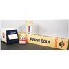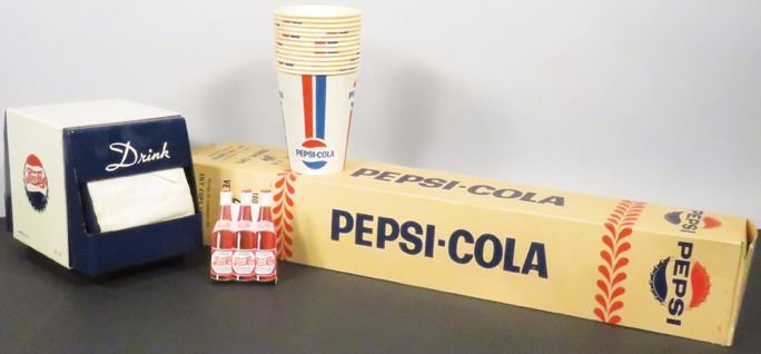 Collection of Pepsi Cola Items. Pepsi Double Dot table top display, napkin holder and full unopened box of 9 oz drinking cups by Lilly. Overall NOS condition.