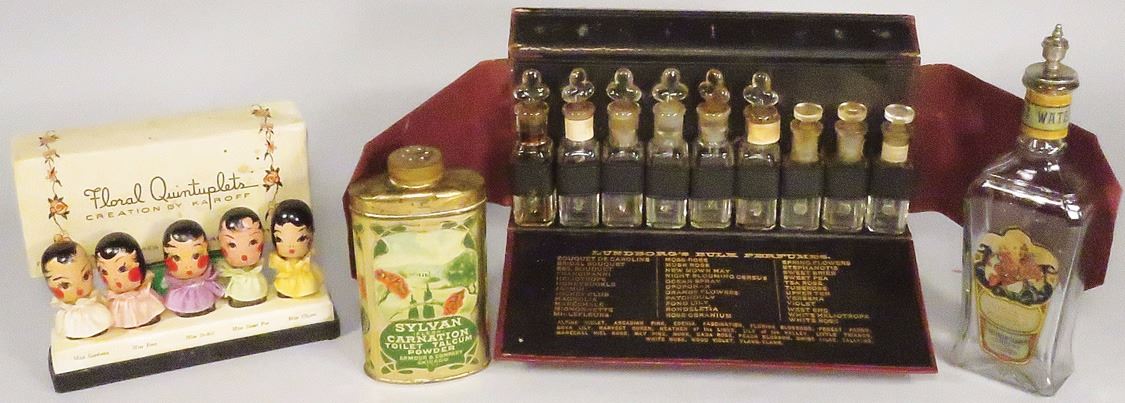 Collection of Perfume and Talc Items. Lundborg's Bulk Perfume, glass bottles in carrying case. Floral Quintuplets perfume collection. Purity Violet Water, embossed with paper label. Sylvan Carnation Toilet Talcum Powder Tin. Overall very good condition.