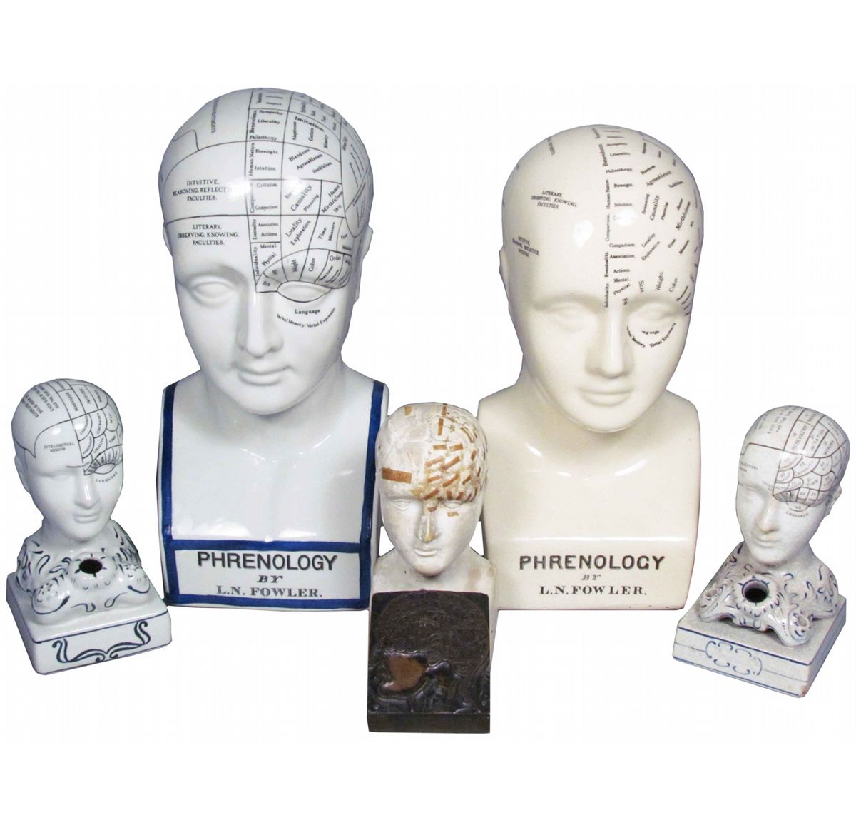 Collection of Phrenology Items. Five porcelain busts and Printers Block. All in excellent condition. Largest bust measures 5 1/2 X 12 X 6 inches.