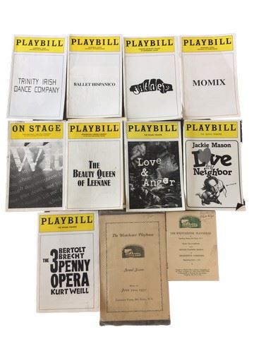 Collection of 11 Playbills from The Annenberg Center presenting "Jitney", "Momix", Ballet Hispanico", Trinity Irish Dance company", The Booth Theater presents "Jackie Love Thy Neighbor", Philadelphia Theater Company presents "Wit", "The Beauty Queen of Leenane", The Wilma Theater presents "The 3 Penny Opera", "Love & Anger", and The Westchester Playhouse presents its second season. (Approx. 10"x6" each).