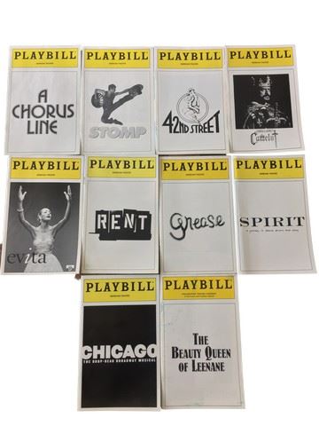 Collection of 10 Playbill's from the Merriam Theater including, "A Chorus Line", "Evita", "Rent", "Grease", "42nd Street", "Chicago", "The Beauty Queen", "Stomp", "Spirit", and "Camelot". (Approx. 10"x6" each)