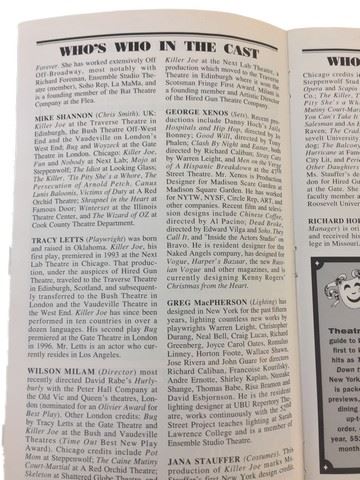 Collection of 11 Playbills from various theaters, an amazing addition to the theater lover's collection. The Merriam theater presents, "42nd Street", "Evita", and "Spirit", The Soho Playhouse presents, "Killer Joe", The Lucille Lortel Theater presents "Steel Magnolias", The 47th Street Theater presents, "The Last Session", The Biltmore Theater presents, "Barefoot In The Park", The New Locust Theater presents, "Happiness Is Just A Little Thing Called A Rolls Royce", The Royale Theater presents, "An Inspector Calls, The Prince Music Theater presents, "Laurie Anderson songs and stories from Moby Dick", and a Stagebill from The Lincoln Center. (Approx. 10"x6" each).