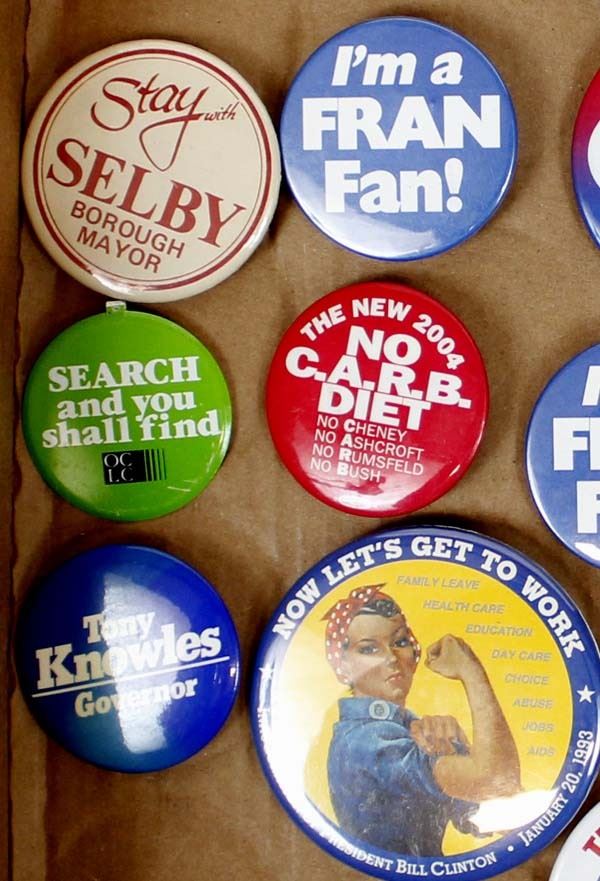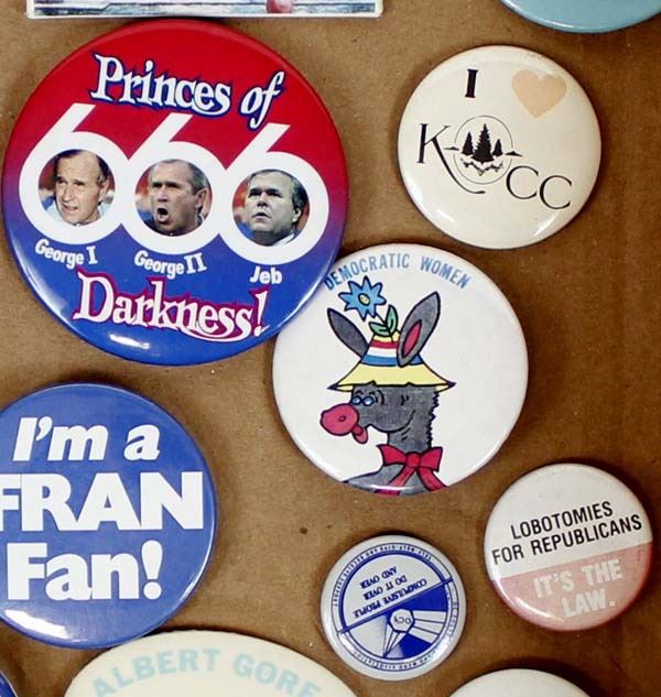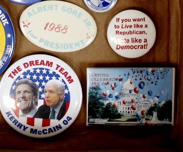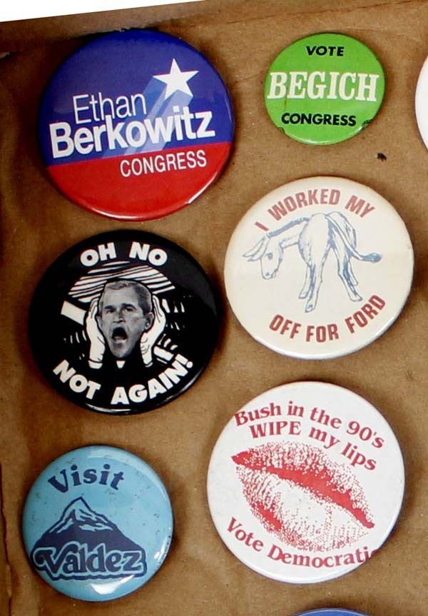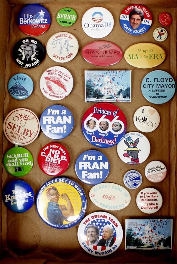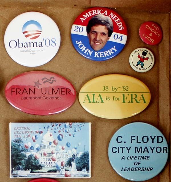 Collection of Political Buttons Plus, largest measures 3''D, includes Obama '08, Kerry, Ulmer, Berkowitz, 1993 Inauguration of Bill Clinton, Kerry/McCain, Knowles, and others