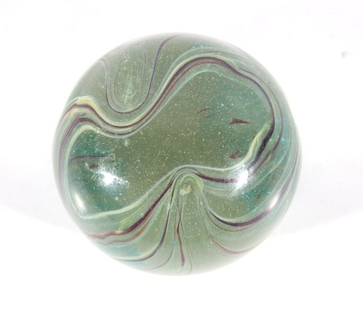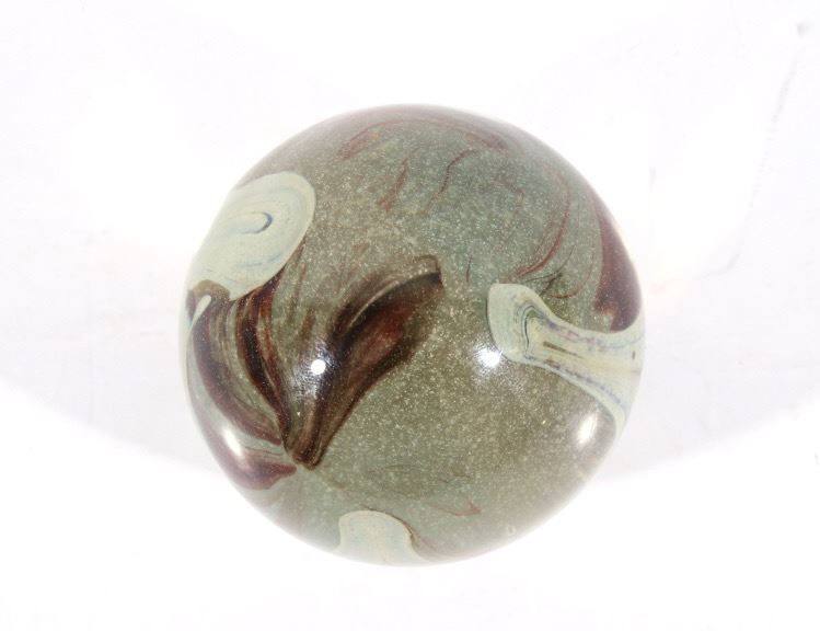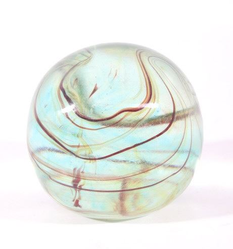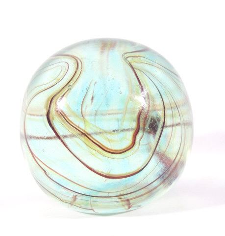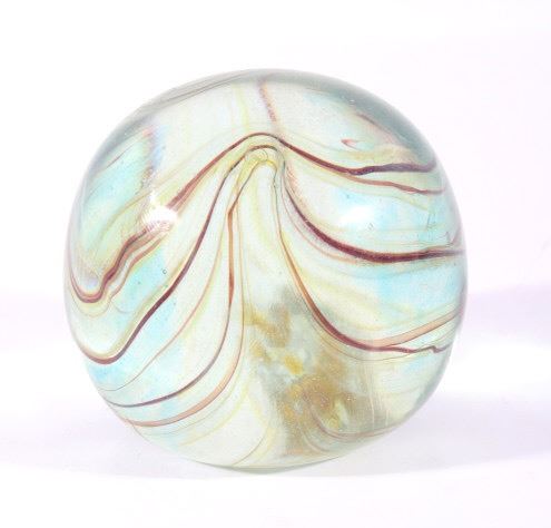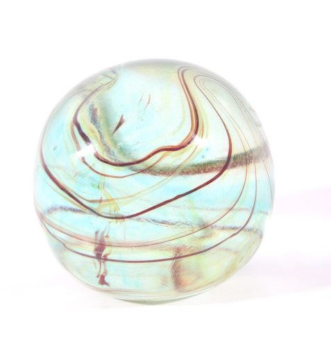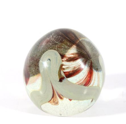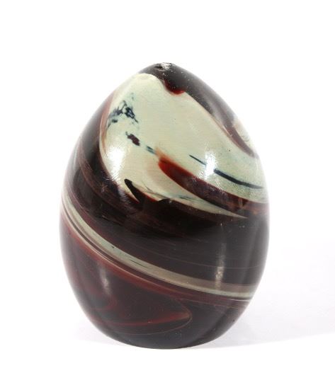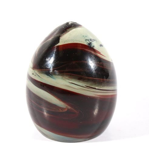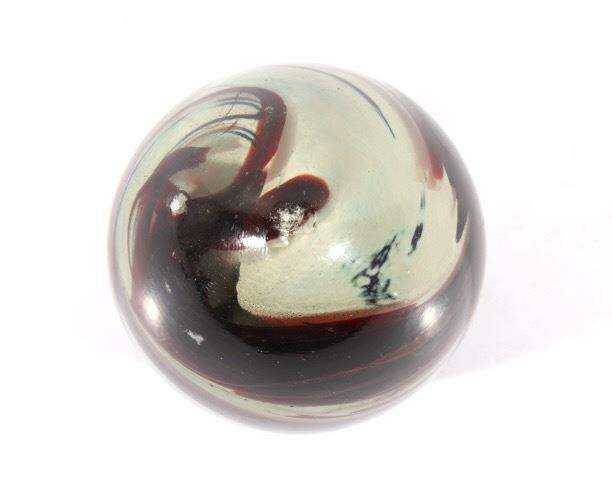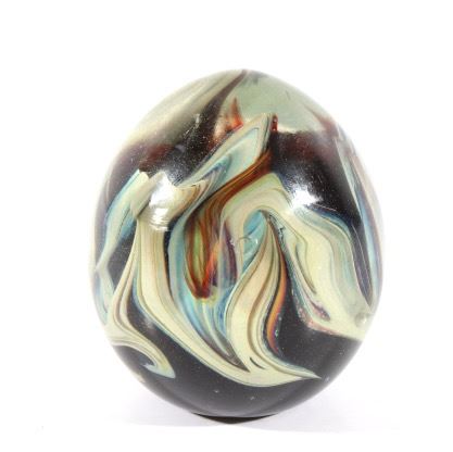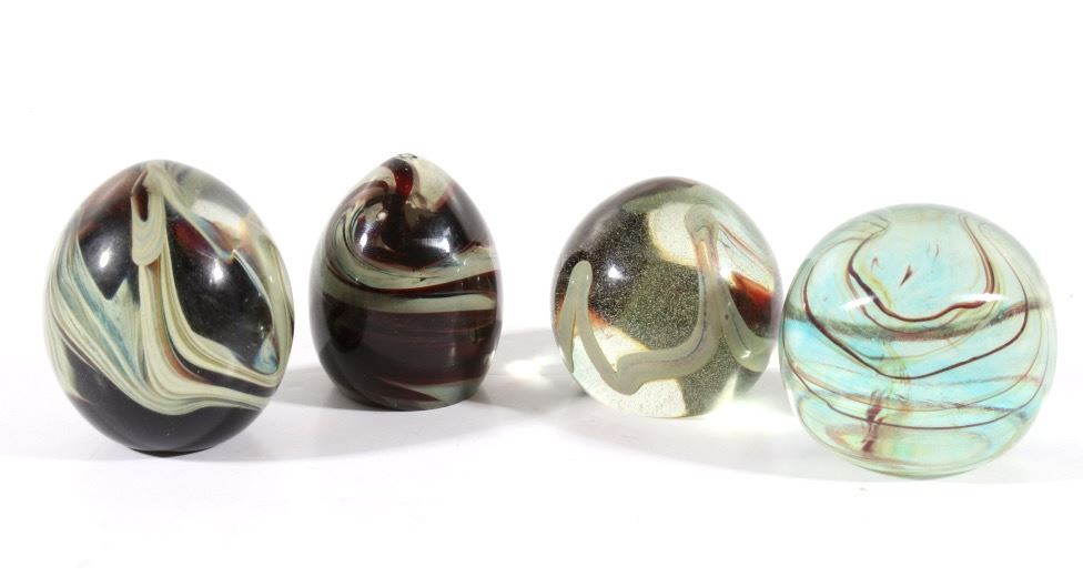 Featured in this lot we have a collection of four polychrome glass art paperweights. The first of the pieces is a slightly egg shaped orb with rippling and contrasting colors infused in the glass. The orb shows colors of red, yellow, light and dark blue, white, and black. The next weight is also more egg shaped with contrasting colors rippling and circling each other below surface of the glass. It shows colors of blue, white, red, and a deep dark red. The third piece shows thick cluster of small clear bubbles at the center with ribbons of color the edge of the piece. The orb shows color white and red primarily with some purple and blue. The fourth and final glass art piece shows thin rippling patterns of color around a clear center. The piece shows colors of red, white, purple, and blue. The paperweights would make a wonderful addition to any mantle, desk, or display. The pieces show good condition with some minor damage on the second orb. The largest of the weights measures 3 1/4" tall with a diameter of 2 1/2.