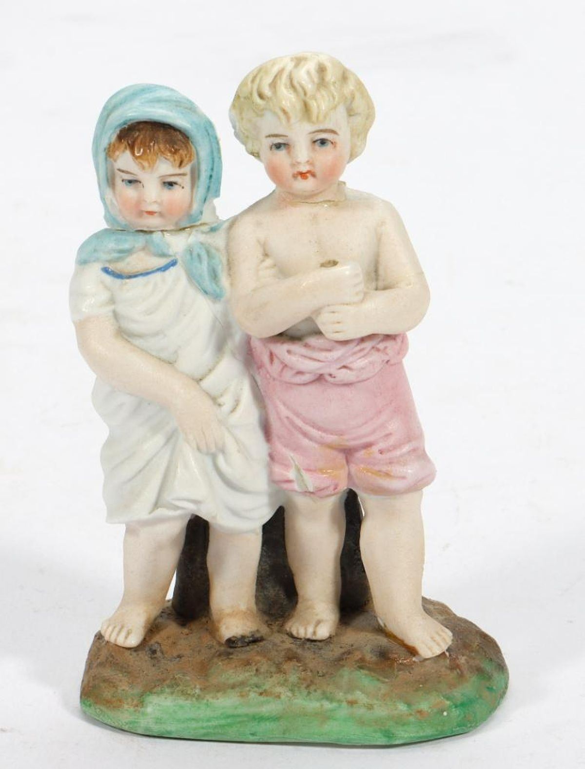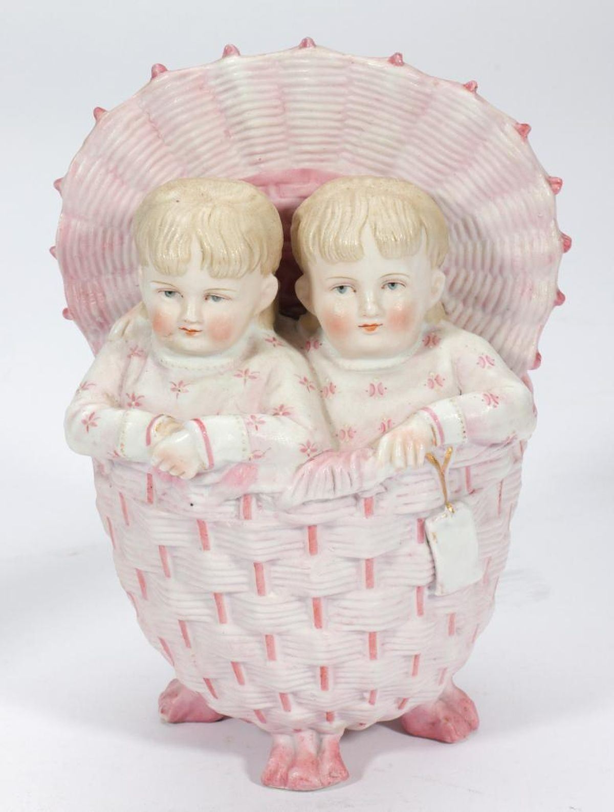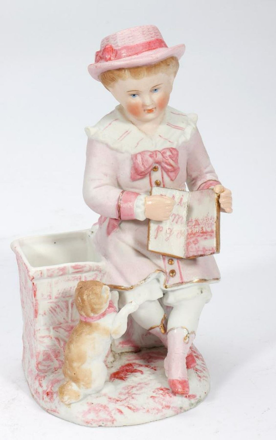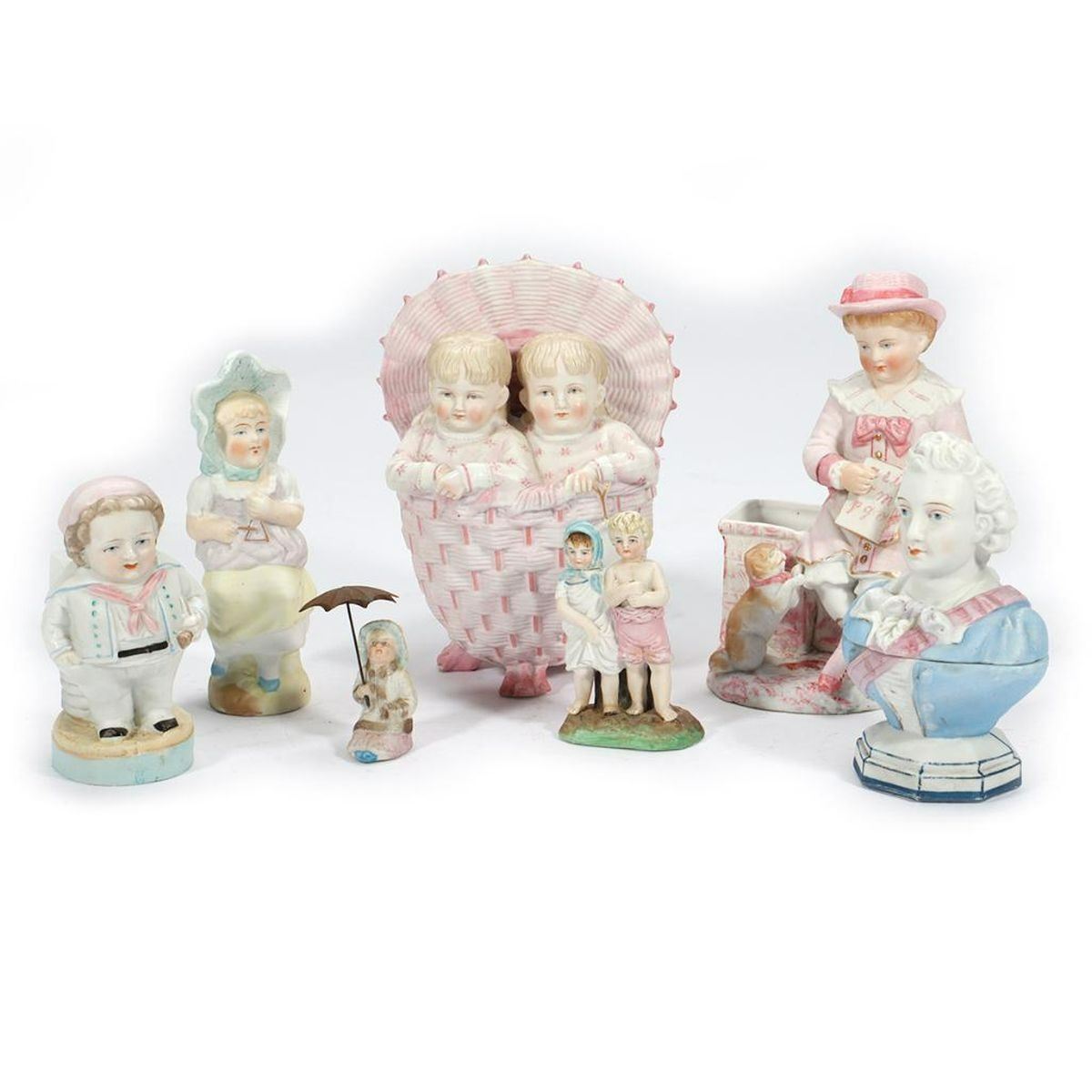 The figurines and vases depicting old fashion children, including two in a basket, and one holding a metal umbrella. Together with a trinket box in the form of an 18th century style gentleman. Ranging from 2 1/2in. to 6 3/4in. h. Condition: Overall good with no chips/cracks found; the small figure of two children with numerous chips and old repair of both heads..