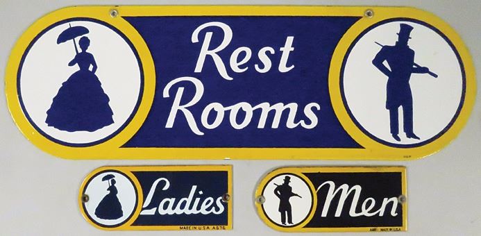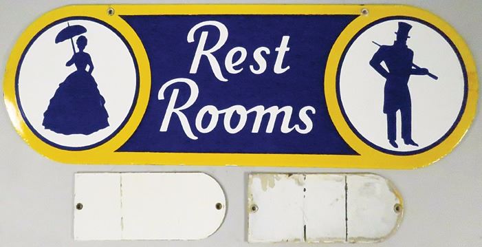 Collection of Porcelain Restroom Signs. Overall minor edgewear large (two sided) sign measures 22 X 7, small 7 X 2 3/4 inches.