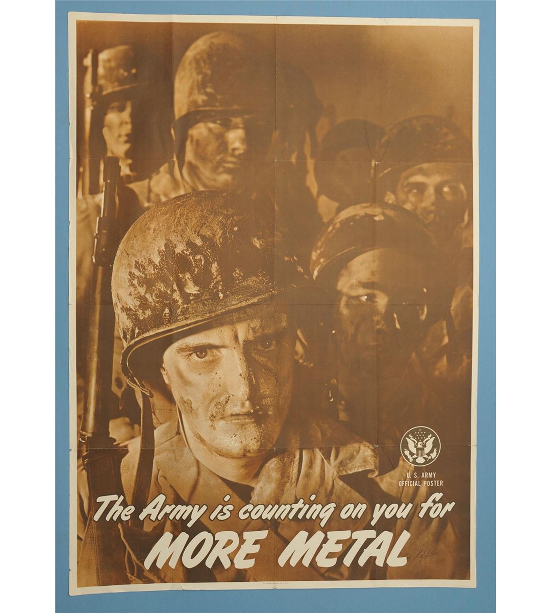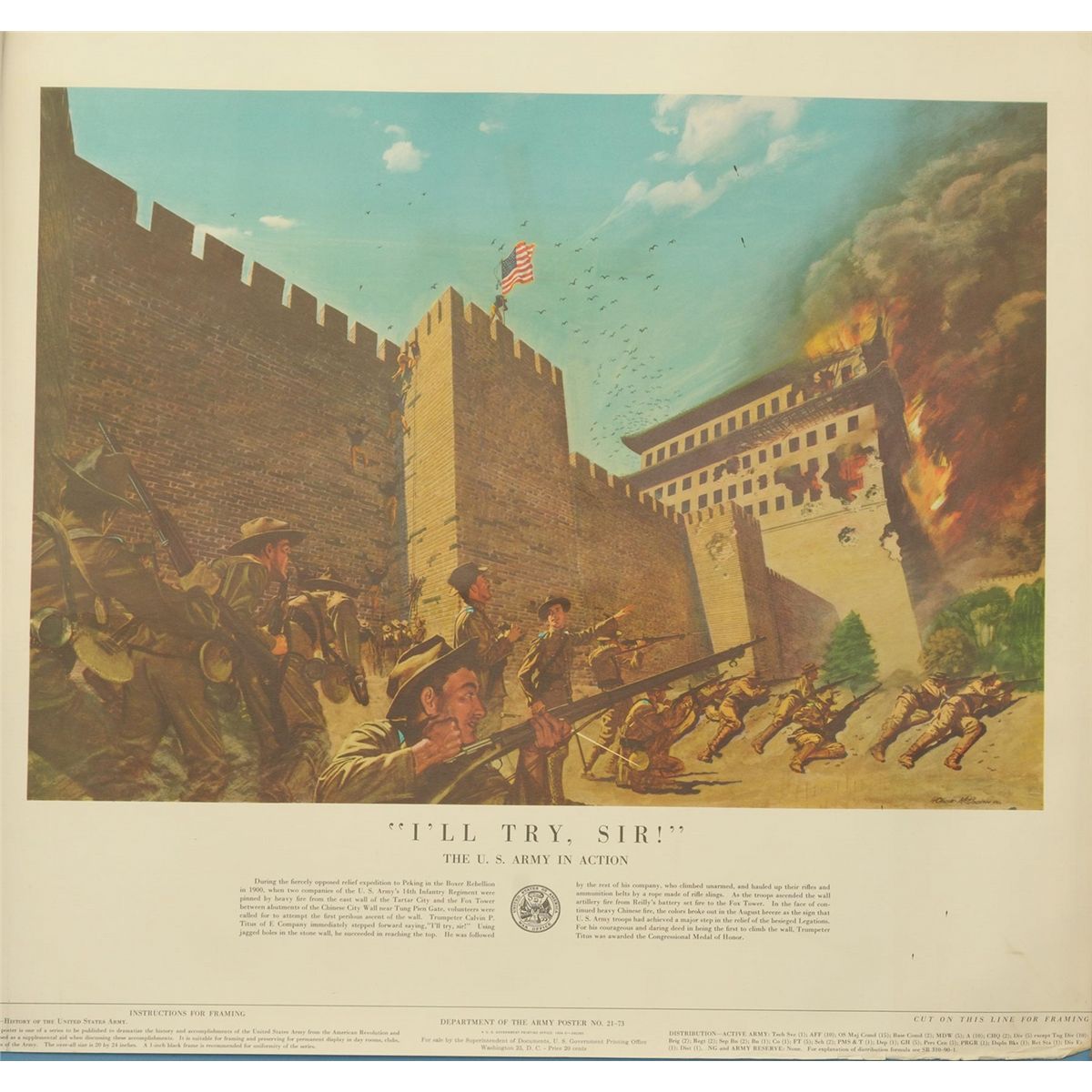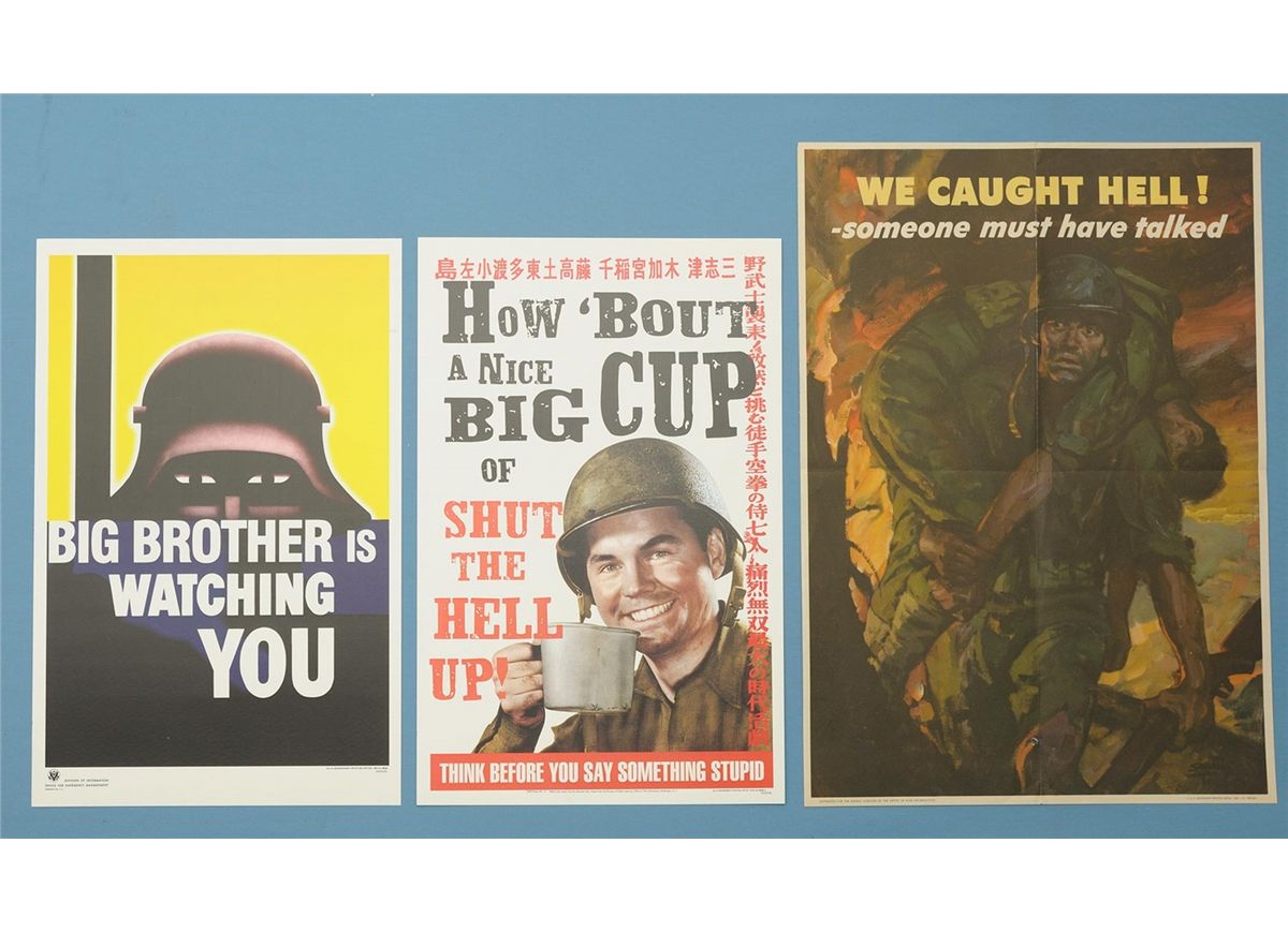 1) "Be A/Cadet Nurse/The Girl With a Future" measures 28" x 20". 2) I'LL TRY, SIR/THE U.S. ARMY IN ACTION" measures 24" x 21". 3)"If you tell where he's going.../He may never get there!" measures 20" x 28". 4) "a careless word.../A NEEDLESS LOSS". 5) 8 reproductions including; "JOIN US/in a VICTORY JOB" and RINGED with MENACE" all measuring 16 1/2" x 11 3/4" . 6) "HOW 'BOUT A NICE BIG CUP OF SHUT THE HELL UP" reproduction and measures 17' x 11". 7) "BIG BROTHER IS WATCHING YOU" reproduction and measures 17 x 11". 8) "WE CAUGHT HELL !/-SOMEONE MUST HAVE TALKED" measuring 20" x 14". 9) "The Army is counting on you for/MORE METAL" measures 40" x 28. CONDITION: 1) Fair. 2) Very good. 3) Good with some tape repairs and tears. 4) Fair with tears and tape repairs. 5) Near new. 6) Near new. 7) Near new. 8) Excellent. 9) Good.