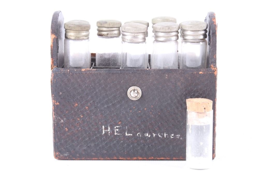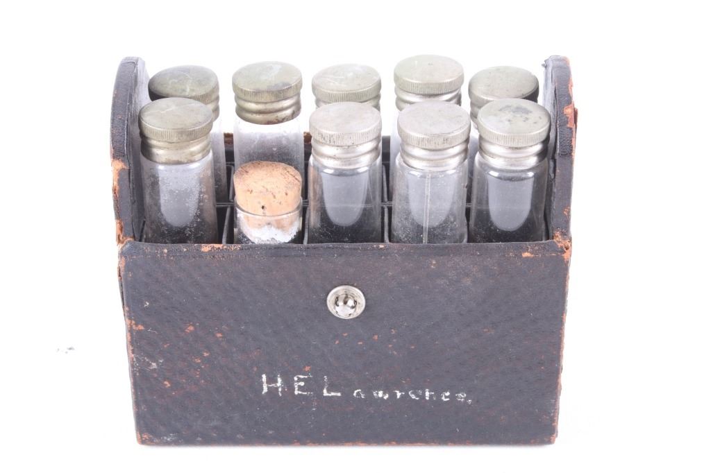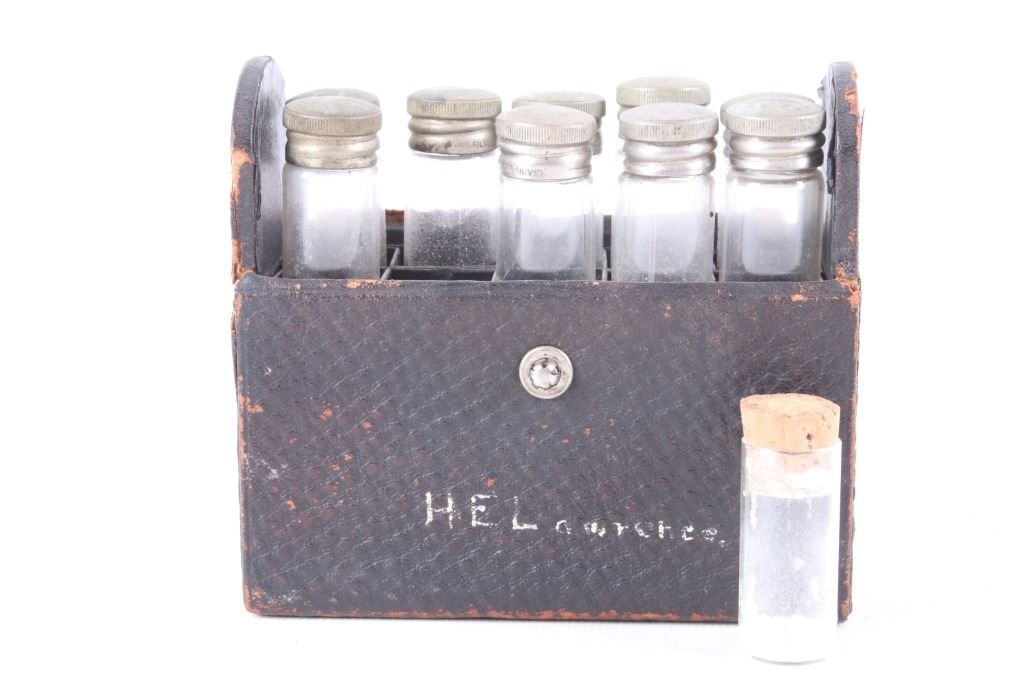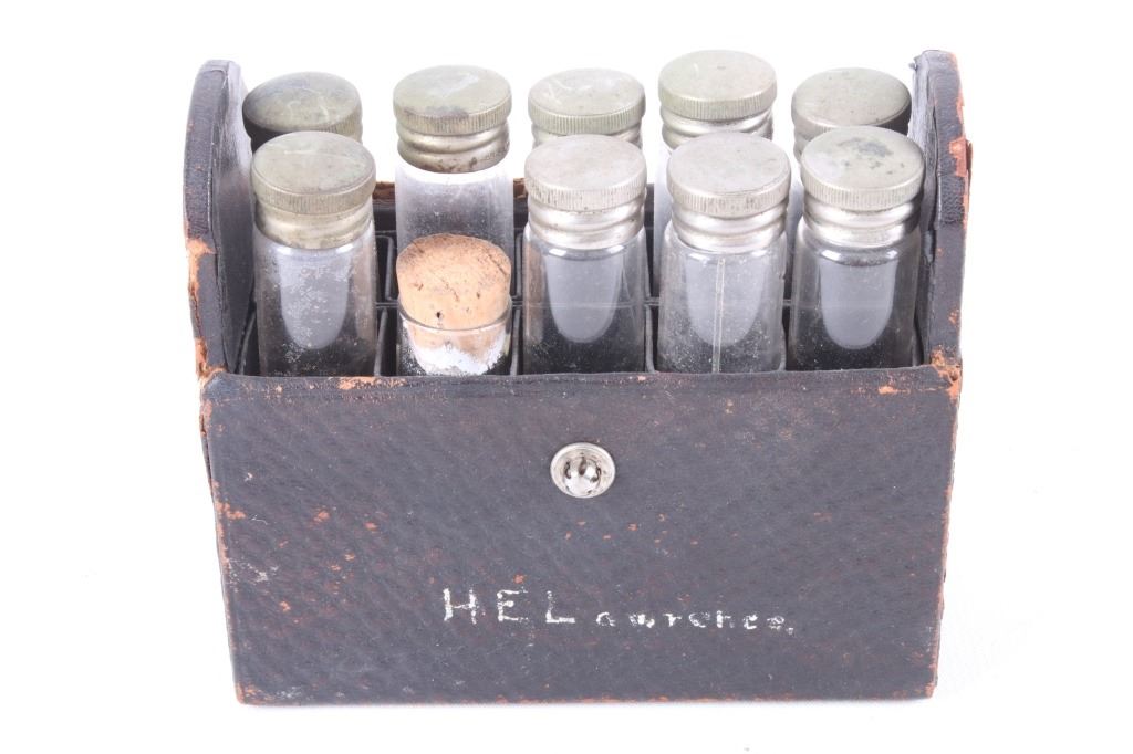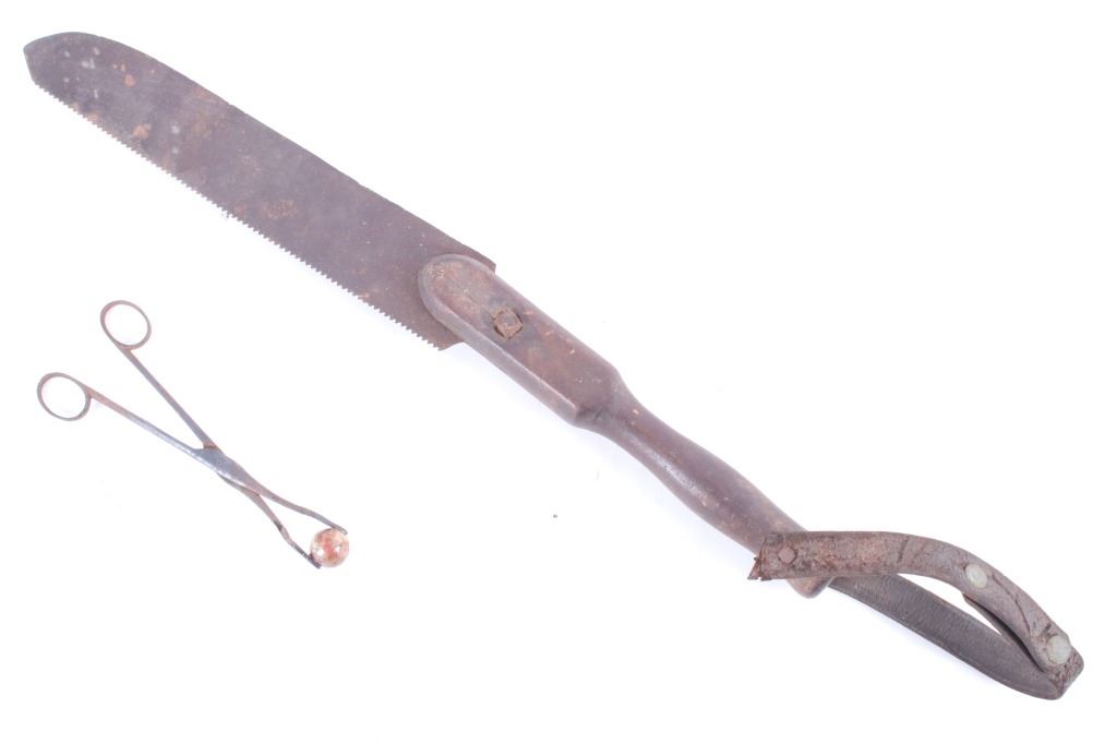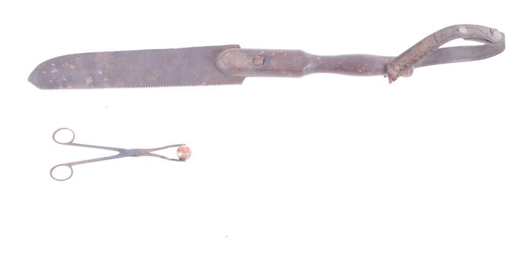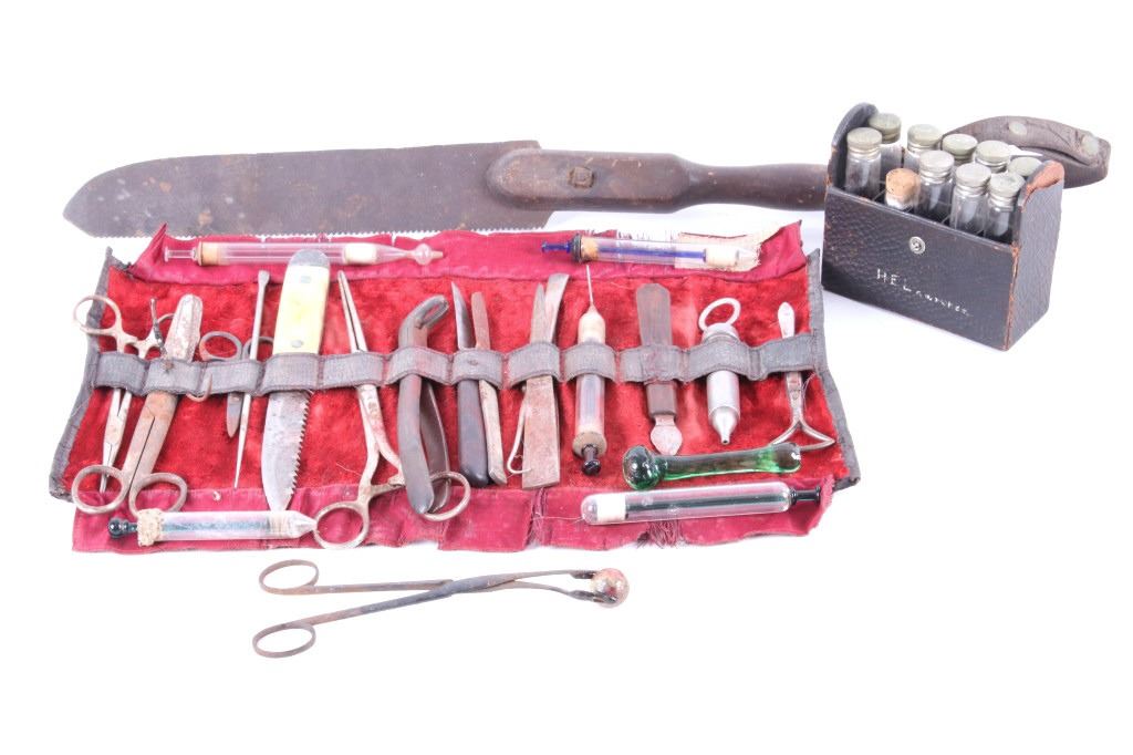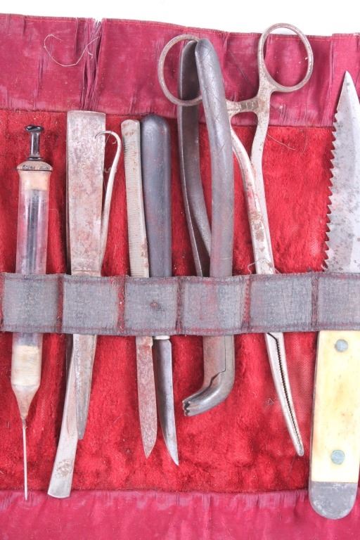 For your bidding pleasure is this Collection of Pre Civil War Surgeon Field Kit. This collection includes a wide variety collection of civil war era surgeons field kit and tools, including a RARE "Sawbones" bone saw. This Lot includes nine full size specimen jars with a single half sized specimen jar that contains a white chalky substance. The specimen jars are arranged in a leather carrier box with HE Lawrence written in white ink on the front. The box shows its age by construction alone with pine frame wrapped in leather, additionally shows some damage to the lid with half of the flap ripped. The Field kit shows a unique array of surgeon tools from a wooden handled bleeder, to scalpels and various surgical pliers. The field kit shows an outer sleeve that all the tools are wrapped up in it is in good condition showing a worn felt lining and a function strap to bundle the whole thing together. The last addition to this lot is a display case showing CIVIL WAR syringes and a pair of pliers holding a musket ball, and a green glass pestle. The measurements of the field kit are 10 1/2" x 5"; and the amputation saw blade 22" long; and the display case 12" x 8 1/4" x 2 1/4".