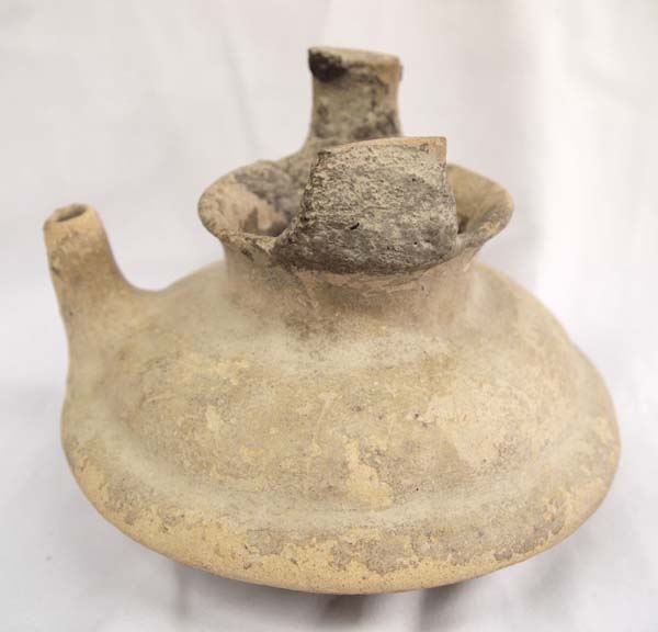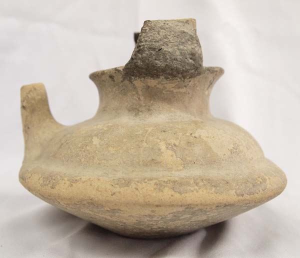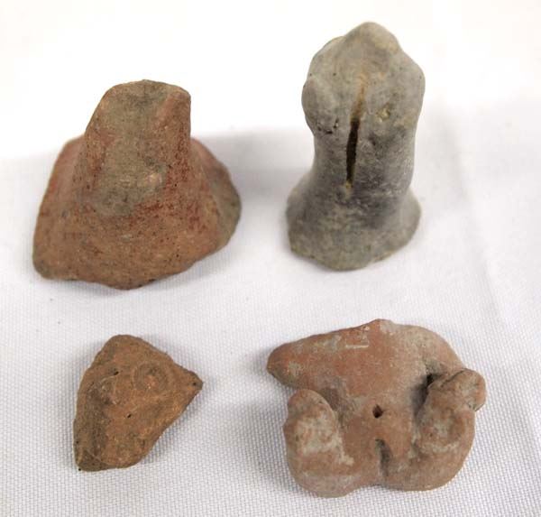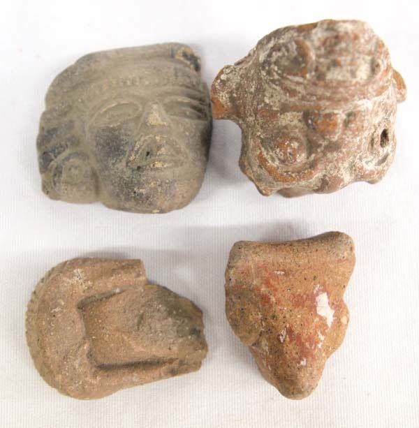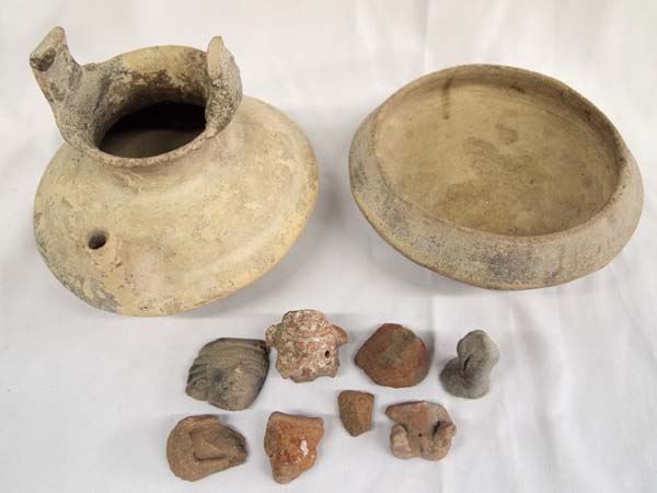 Collection of PreColumbian Pottery Pieces. #1 PreColumbian pot with spout (handle is broken). #2 PreColumbian Bowl. #3 8 pieces small pottery which includes carved heads Throws.. The largest of the small pieces measures approx. 2'' x 1.5'' while the Pot measures 6.5'' x 8''.