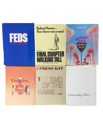 Collection of 6 press kits with black and white publicity stills included, sized mainly 8x10's, from various movie studios. (1970's-80's). From Warner Bros "Feds" (1988), includes 4 stills. From 20th Century Fox "Enemies A Love Story" (1989), includes 8 stills. From Bing Crosby Productions "Final Chapter Walking Tall" (1977), includes 13 stills. From Columbia Pictures "Educating Rita" (1983), includes 9 stills. From 20th Century Fox "End Of Game" (1975) includes 10 stills. From Touchstone Films "Down And Out In Beverly Hills" (1986), includes 7 stills.